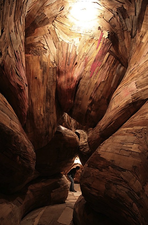 To make his sculptures, which range from the enormous to smaller pieces, he gathers plywood strips of all shapes and sizes, before layering them into forms that are sometimes also painted over, in order to give an illusion of uniform smoothness. Plywood is an inexpensive and abundant material for fencing, and instead of leaving old fences to crumble, Oliveira transforms the linearity of such a humble material into mind-boggling and eye-catching spaces, punctuated by tendrils or mounds of almost-living forms. Other times, Oliveira creates cavernous canyons out of this salvaged material, ones that visitors can inhabit. It’s an ingenious way to reuse a product that’s been broken down so much beyond the point of utility; instead of sawdust, art is created. For the curious, there’s many more impressive images on Henrique Oliveira’s website.