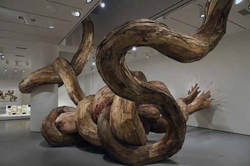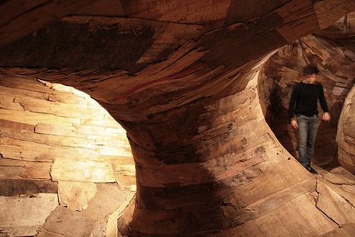 It’s difficult to imagine the equating of weathered construction plywood with a painter’s brush stroke, but that what Brazilian artist Henrique Oliveira does with his impressive three-dimensional sculptures made entirely out of layers upon layers of pieces of peeled, old plywood, collected from various construction sites around Sao Paulo. Originally a painter, Oliveira began making his sculptures (some of which look something like gigantic roots bursting into a room) after spying an old, peeling wooden fence outside of his studio. He intuitively saw the peeling strips of wood as something similar to that of a brushstroke laid down by a painter’s hand, and since then, has worked with aged plywood in this way, much like a painter would colour a canvas. To make his sculptures, which range from the enormous to smaller pieces, he gathers plywood strips of all shapes and sizes, before layering them into forms that are sometimes also painted over, in order to give an illusion of uniform smoothness.