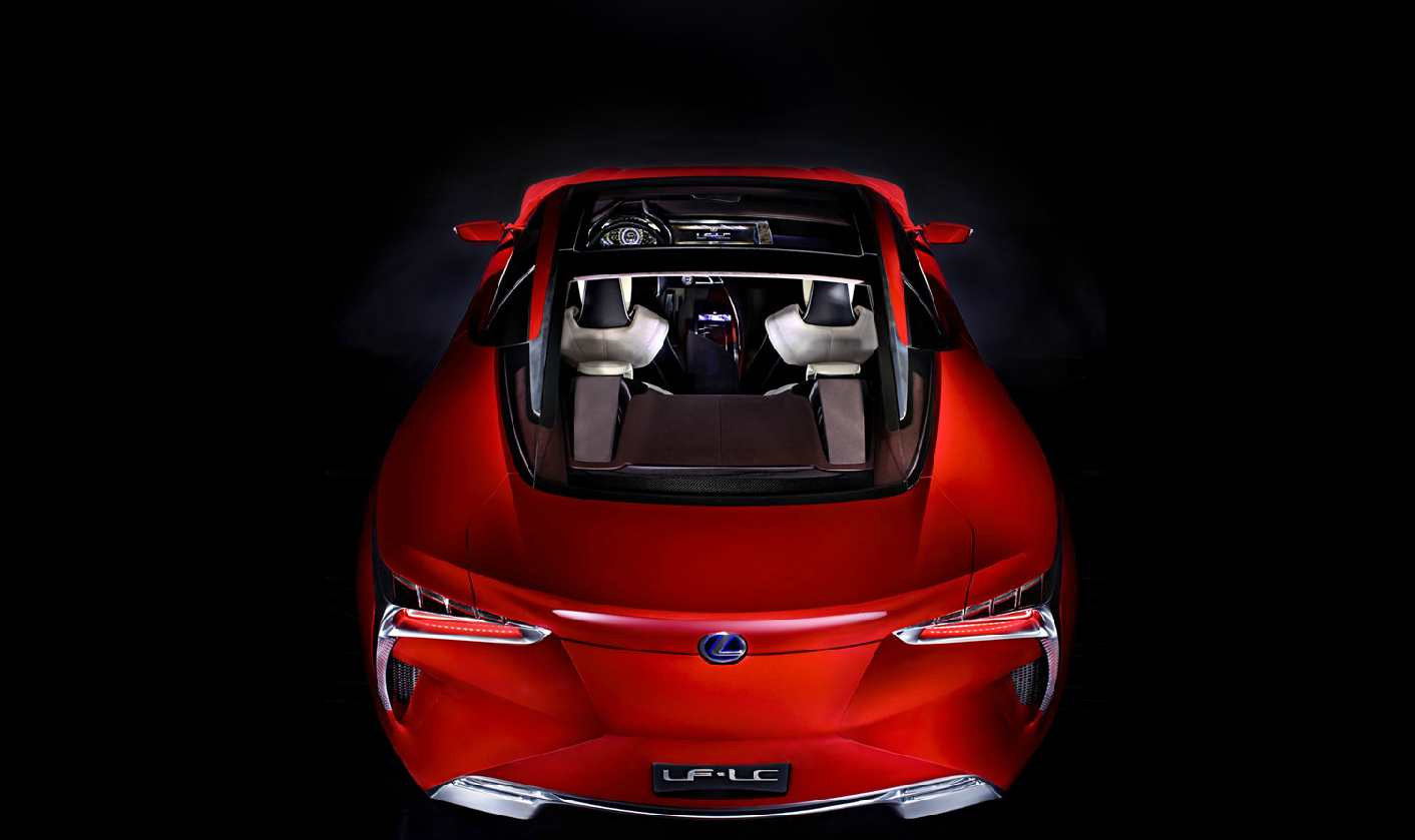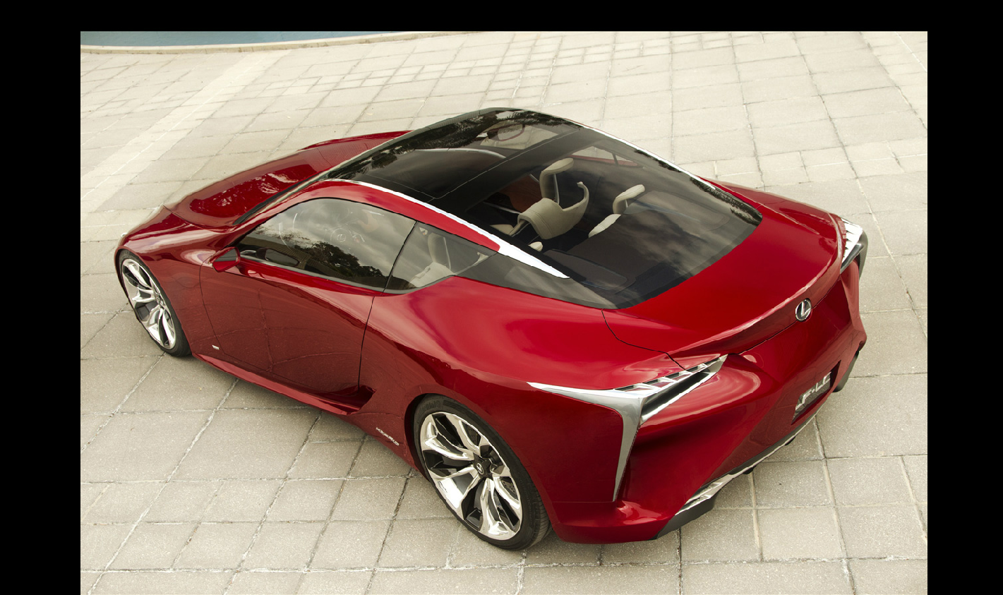 The profile of the LF-LC creates a powerful, dynamic silhouette that is unmistakably that of a serious driver’s car. The lines of the vehicle emphasize direction and motion. The concept car’s glass roof features a lightweight, cantilevered pillar with a glass-to-glass juncture inspired by modern architecture. A rising, kick-up window graphic and polished aluminum trim are unexpected elements. Overall, the greenhouse design enhances driver visibility while adding to the sleek lines of the car. The dynamic cabin lines are carried through to the rear deck, sculpturally integrating the spindle grille theme to echo the front of the vehicle while creating a unique sense of width. The tail lamps, inspired by the look of a jet afterburner at take-off, use inner lighting to create a remarkable sense of depth. The rear is also fitted with fog lamps, repeating the fading dot matrix pattern of the front fog lamps.