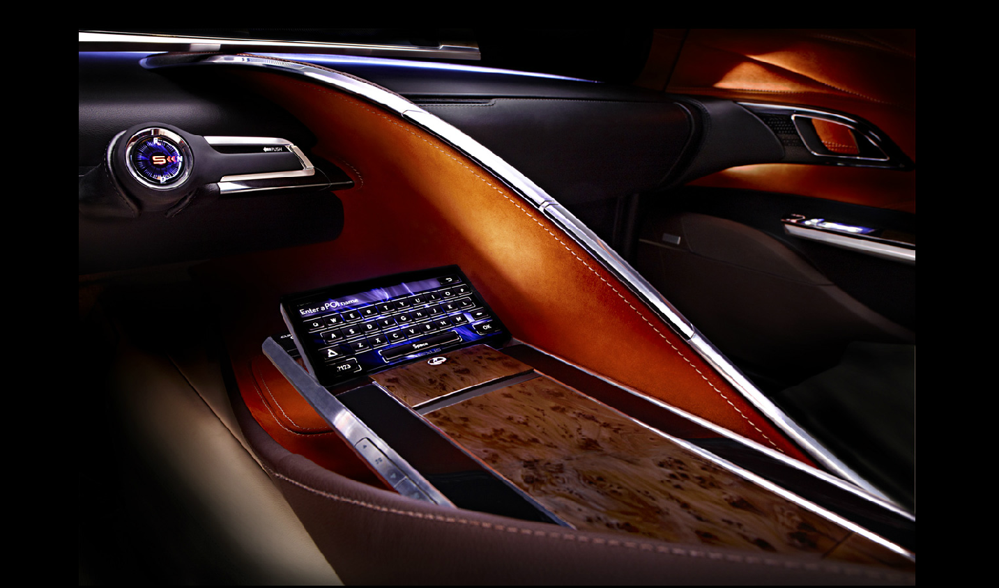 Visually, the integrated tail and fog lamps repeat the “L” shape and lead the viewer’s eye down to the powerful Lexus quad exhaust. The interior of the LF-LC concept vehicle contrasts the cool ambiance of advanced technology with soft textures and organic shapes to create a driver-focused synergy of form and function. The cockpit expresses a feeling of both openness and security. The driver is enveloped by deeply scooped side panels and a high, curved console. The effect is to focus the driver zone on the controls and on the road. Based on Lexus’ commitment to creating an intuitive driving experience, the LF-LC incorporates a remote touch-screen device that allows the driver to comfortably operate controls without shifting position or altering line-of-sight.