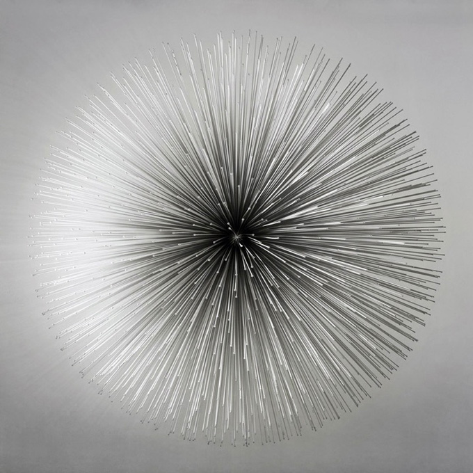 Is it visual art, audio art, a sculpture, a product, a machine? Byoungho Kim’s works could be described as all of these. They are visually stunning, make sounds, have a sculptural quality and they are manufactured just like any other highly-engineered industrial products. Born in Seoul, Korea, in 1974 Kim has explored the edges of art and product, sounds and visuals throughout his career. As his sound sculptures have no “practical use,” they are defined as art but their intrigue lies in the technology behind them. The two lighting fixture-like pieces we are featuring are made of aluminum and they use both piezo and arduino technology. A piezo is an electronic device that be used to both play and detect tones. arduino is a popular open-source single-board microcontroller. None of this means much to most of us, but the result — sounds being emitted and changed by the sculptures — is fascinating.