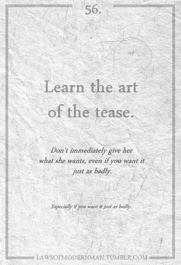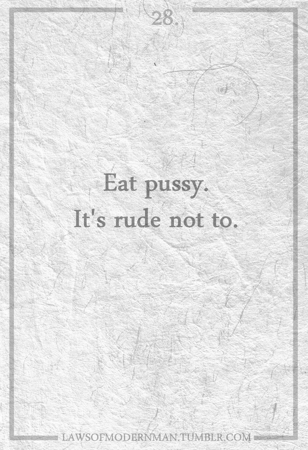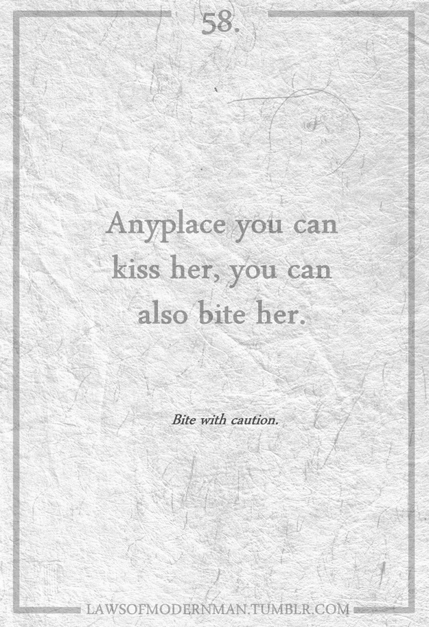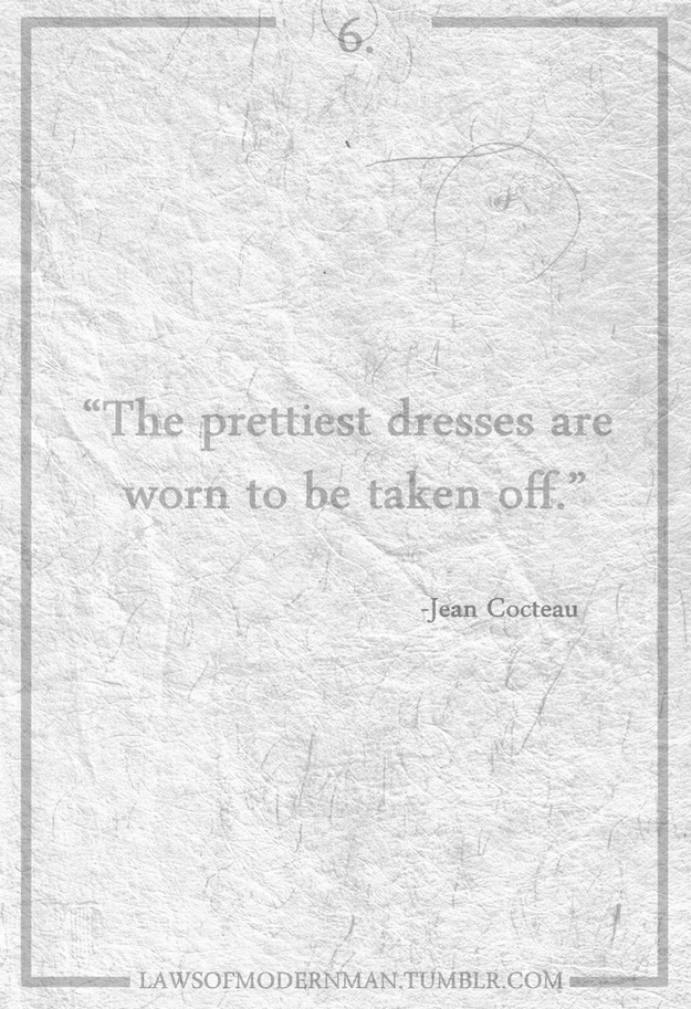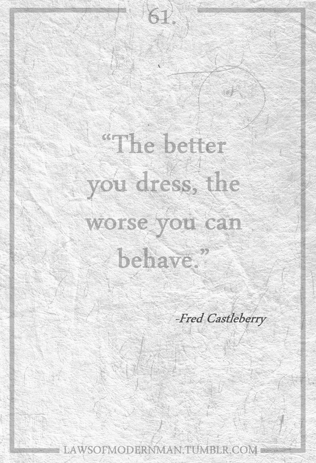 I came across a very interesting quote this morning that read “Take a risk. Be spontaneous. The suffering that might come from a mistake is usually less intense and less enduring than the suffering of asking ‘What It?'”. It was quite striking of a quote and quite a well designed photo. Along the bottom I noticed the URL “Laws Of Modern Man” on Tumbrl, and dug through some more of their stuff. Both classy, and irreverent, the witty laws are all quite true on some level. Check a few more of the laws out below.
