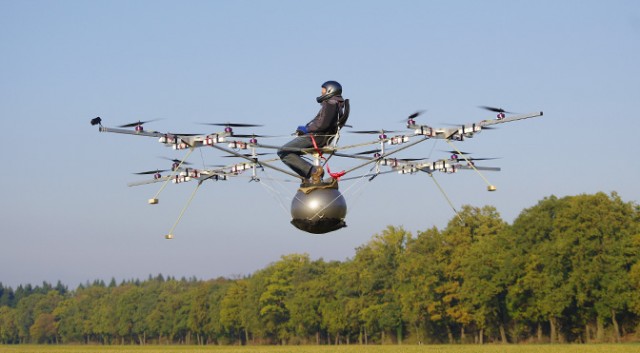 Piloted by the physicist-cum-maniac Thomas Senkel, the E-volo Volocopter (VC 1) is basically a scaled up version of a remote-controlled robotic quadcopter or hexacopter. The multicopter obviously has to have space for a human, though — which as you can see in the picture above is a chair attached to a… space hopper.