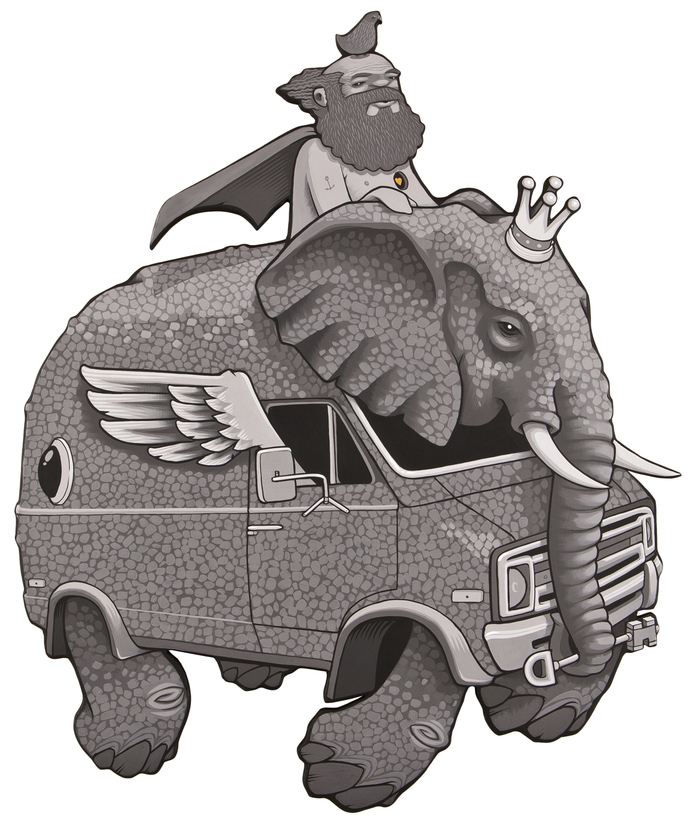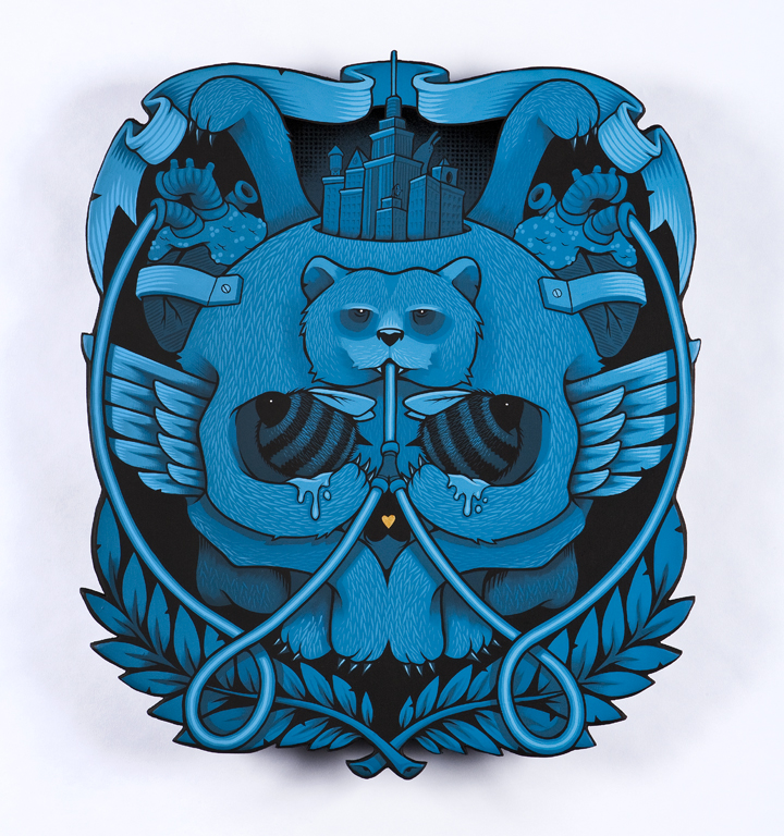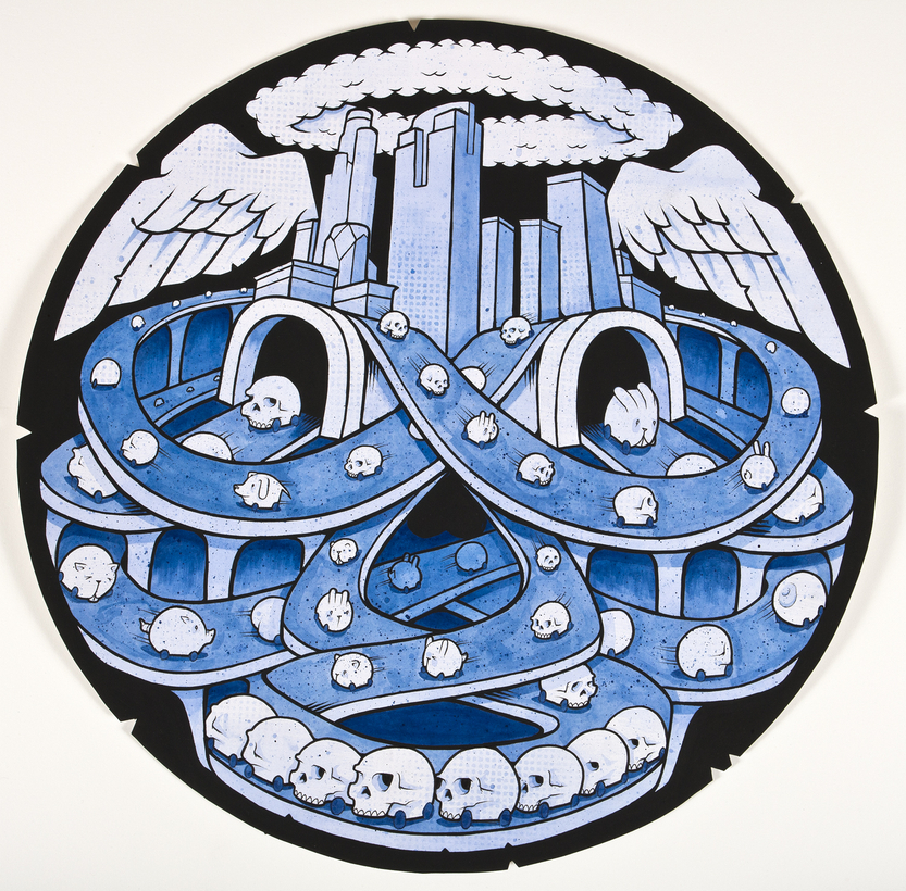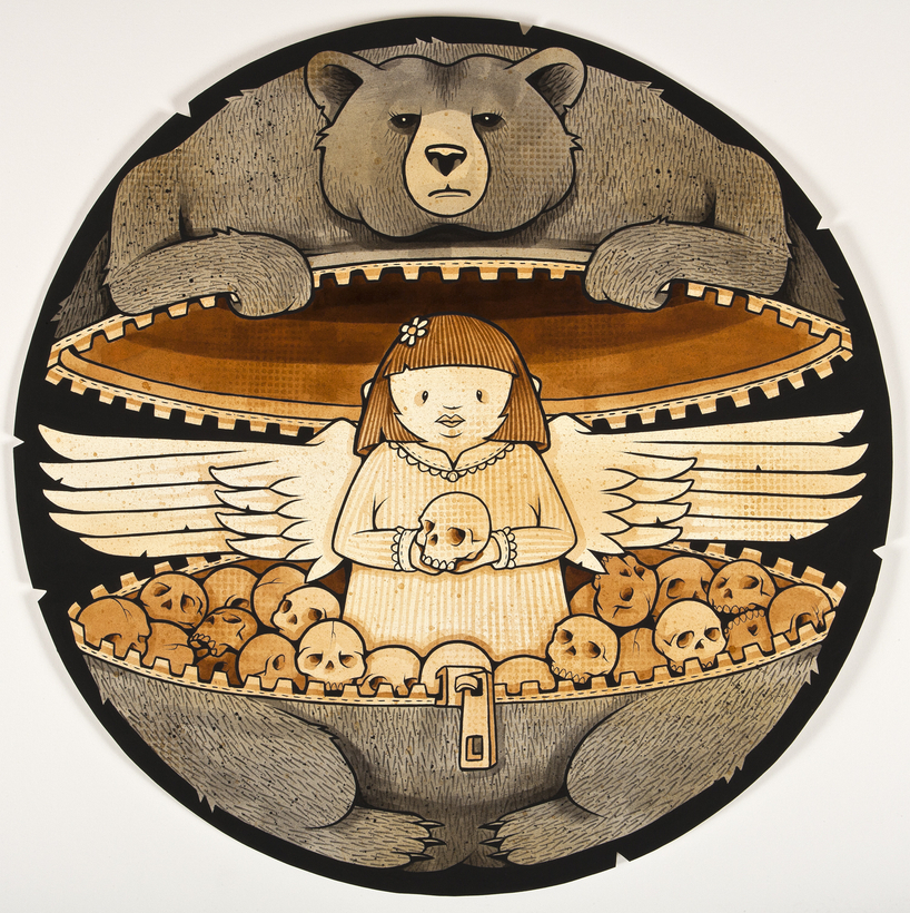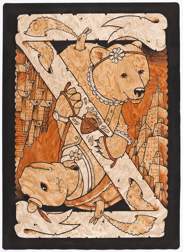Mark Moore Gallery presents Rise of the Underground, a two-person exhibition featuring new works by Jeremy Fish (CA) and Kenichi Yokono (Japan). Each adopting the age-old craft of woodcutting through a distinctive contemporary technique, Fish and Yokono employ bold and enchanting cartoon-like narratives to illustrate quotidian and pop cultural excerpts. Unmistakably handmade and remarkably intriguing, Yokono’s woodblocks explore the “horrors of everyday life,” while Fish’s paintings and cut-outs reveal untapped histories often swept under the rug. Seemingly innocuous at first observation, each work is intricately laced with undercurrents of the sinister and the foreboding, saturated with cultural reflection, psychoanalysis, and social commentary in a fusion of high and low aesthetics.