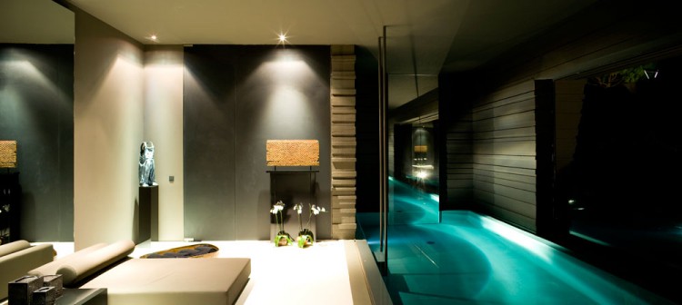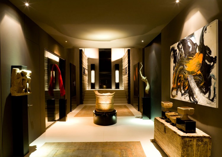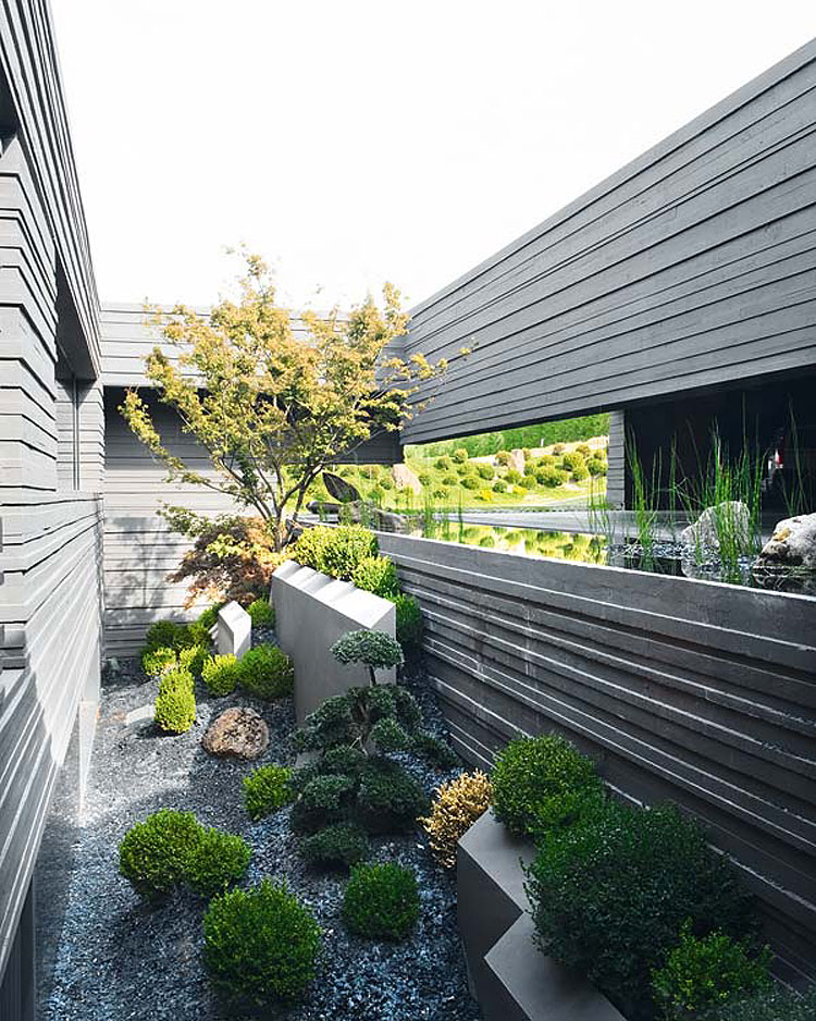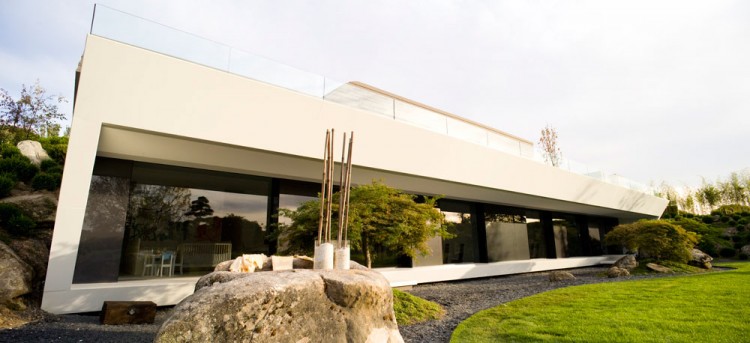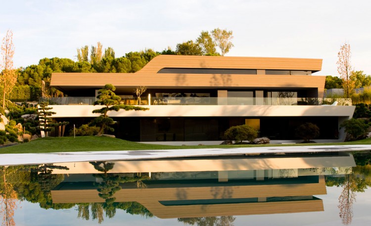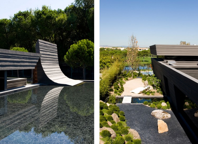 The landscaping, designed by A-Cero, is clearly Japanese-inspired, as shown by the abundance of large bonsais and different species of flowering trees and bojs. Also, large ornamental rocks bought from Galicia were carefully placed. The large curved swimming pool (400 sq m/ 4,300 sq ft), is covered with a dark gray liner (PVC laminate slip). The pool features the “disappearing edge” and this effect achieves a continuity between the pool and lake. In the middle of the pool is placed a sculpture of orthogonal forms that seems to float on the water’s surface. This is a sculpture by Austrian sculptor Ernesto Knorr and is made of cut steel.”