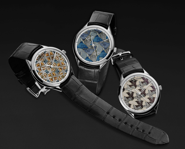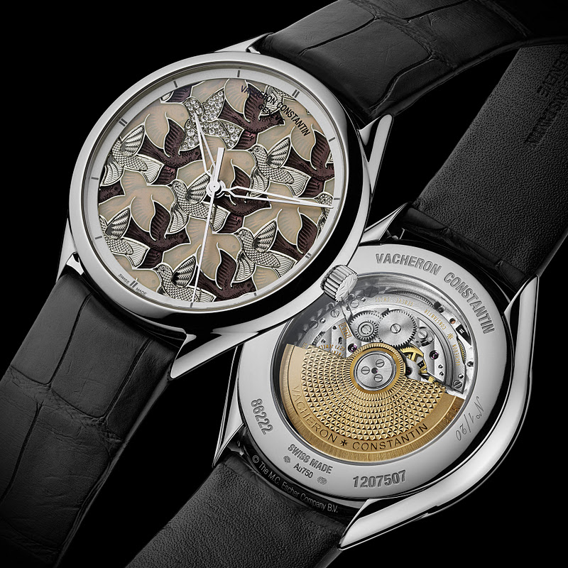 You may recall from last year that Vacheron Constantin created a phenomenal piece unique for Only Watch 2011, the M.C. Escher-inspired “Dove” watch. At SIHH 2012, Vacheron went on to show off 3 more M.C. Escher-inspired watches in the same style. These pieces are part of Vacheron’s Métiers d’Art collection. The Dove watch features hand-guilloché work in its final phase of craftsmanship and one bird in this ethereal scene has been diamond-set with 38 brilliant-cut stones. The Fish watch features cloisonné enamelling, achieved by first marking each outline using fine gold wire before the enamelling process. The Shell watch features champlevé engraving – each field is hollowed out individually before the enamelling work is added. Each piece of the Vacheron Constantin Métiers d’Art Les Univers Infinis houses the Vacheron Constantin manufacture Calibre 2460SC with 40 hours of power reserve inside a 40mm case made of 18K gold.
