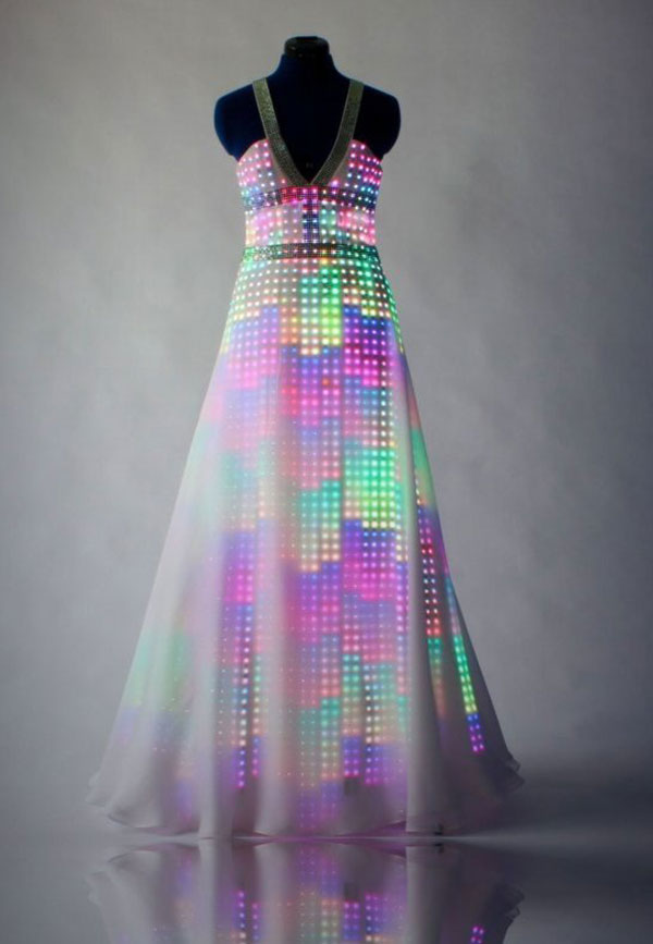 The Aurora Dress is a spectacular piece of haute couture which was designed by CuteCircuit exclusively for an opera performance hosted by Swiss company Breitling. Designed with a daring plunging neckline adorned with hundreds of Svarovski crystals, this unique evening gown creates a stunningly elegant silhouette. Made with silk taffeta and chiffon, the Aurora Dress includes LEDs technology that creates many different patterns, from sparkly colors to an incredible fall of rainbow. CuteCircuit designers have taken their inspiration from the spectacular colors and lights of the Aurora Borealis… Aurora, as the Roman goddess of the dawn who flies across the sky every morning to announce the arrival of the sun.