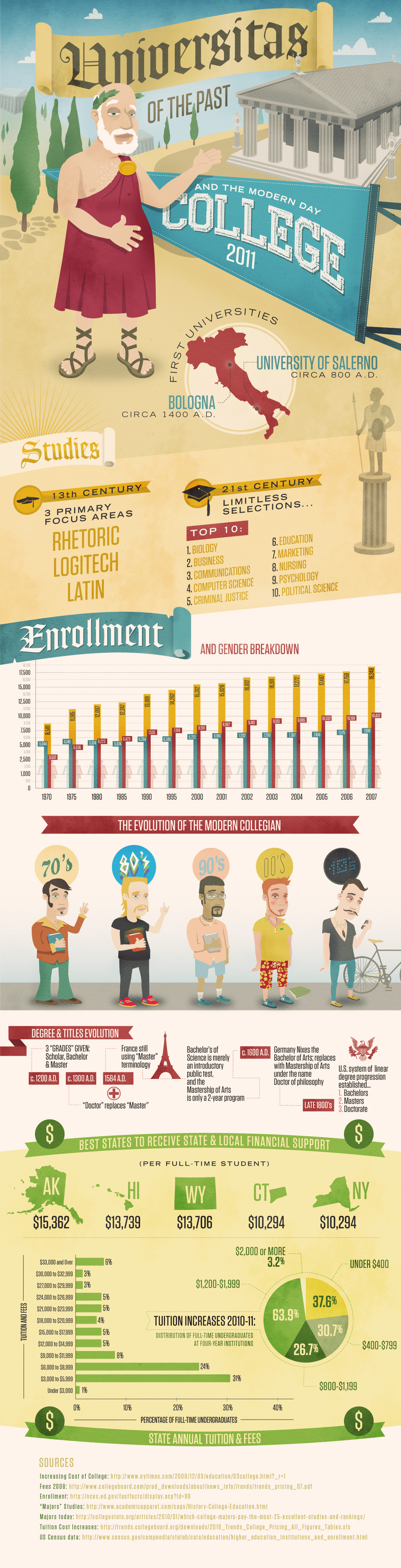 People have sought out higher learning since circa 800 A.D. But that’s about the only thing that has remained the same. From who is enrolling to which degree programs are offered to where the best degree programs are located, education has vastly changed. The infographic below showcases many of those changes. Degrees titles have evolved from “Master” to “Doctor.” The degrees themselves have gone from those focusing on “rhetoric” to focusing on “computer science.” More women now enroll and graduate than men. People no longer even need to “go” to college as online education becomes more readily available from accredited universities such as American Intercontinental University. Educational options in this modern era are nearly limitless.