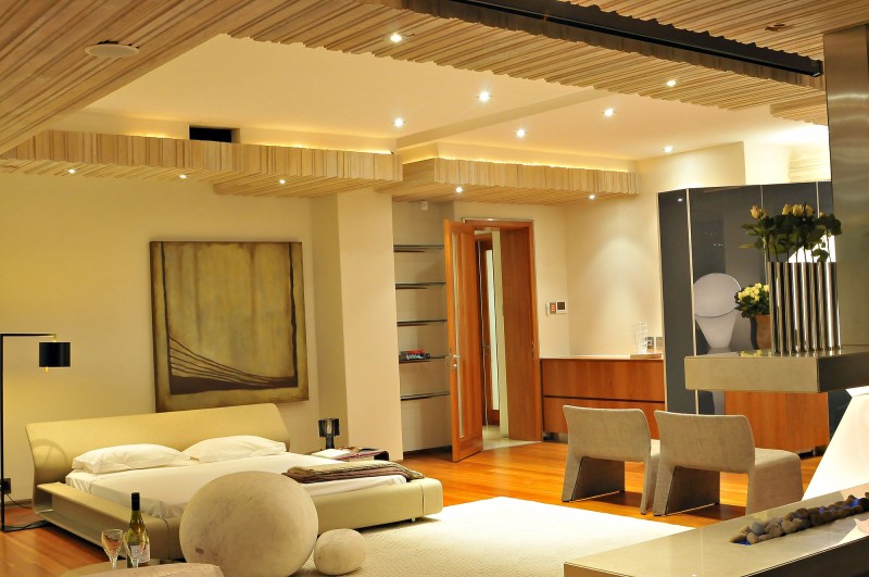 The study is a glass box at the top of the staircase, with a view over the pools at the bottom. A large playroom is situated next to it, with an intimate home theater and kitchenette, leading to a large balcony with a shaded porch. The main bedroom on the other side of the hall is reached via a gallery looking down into the dining room and out to the garden. The main suite has a small lounge and built-in kitchenette, with a drop-down screen and projector built into the bulkhead.