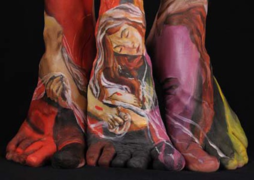 Museum Anatomy (a project by Laura Spector and Chadwick Grayis) is a collection of documentary photographs of works from museums around the world that have been recreated onto the human body. The artwork goes through a significant process until reaching the final outcome, a photograph of Chadwick, sometimes unrecognizable as a human form, with an elaborate, detailed painting covering a portion of his body. The recreated paintings of these historic portraits recapture the subjects in their own moment in history. The resulting photographs reveal a unification of art combining antiquity, history and technology in a contemporary context.