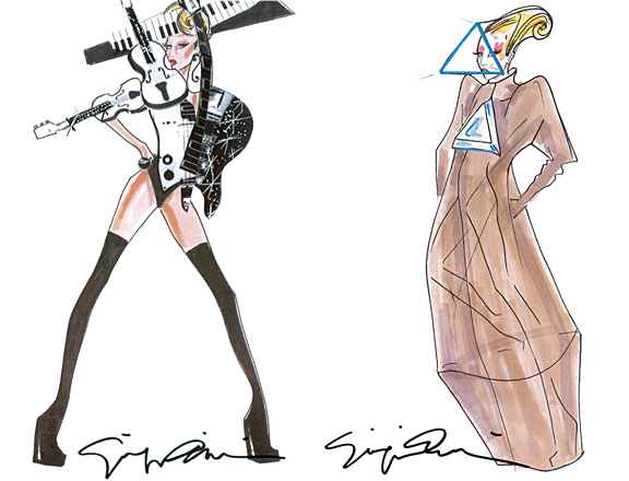 Lady Gaga and Madonna’s outfits for their respective upcoming tours look set to rival one another in the high fashion stakes, the latter has Jean Paul Gaultier on hand, while Giorgio Armani has just revealed sketches of his creations for Gaga. On April 19 Armani unveiled a string of predictably wild custom-made outfits for the songstress, including lashings of luminous PVC, a keyboard head piece and, naturally, spiky shoulders. “Collaborating with Lady Gaga is always an exciting experience for me. I admire the way she uses fashion as a scenic element and as a means to build a character,” said Armani, who also created looks for her 2010 Monster Ball tour. “She is an artist of many talents and great intelligence. Creating stage costumes for her is a stimulating and creative exercise.” While Gaga’s Born This Way Ball kicks off April 27 in Seoul, Korea, Madonna starts the MDNA Tour May 29 in Tel Aviv, Israel. The songstress confirmed that her long-time collaborator Gaultier, who came up with the iconic pieces of her 1990 Blonde Ambition tour, is helping out with costumes.