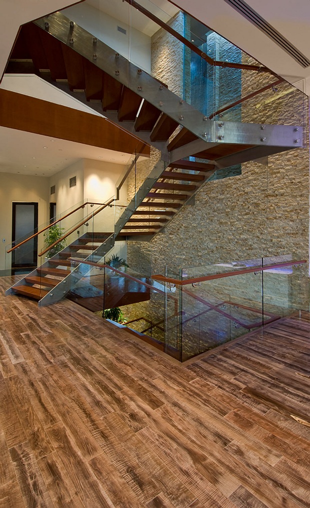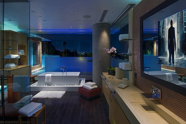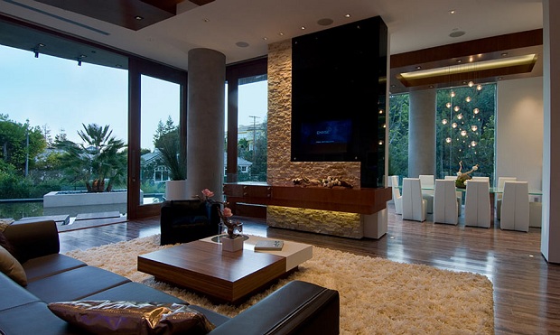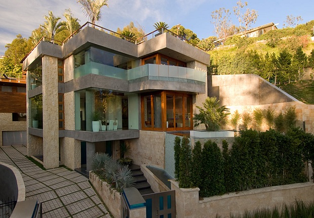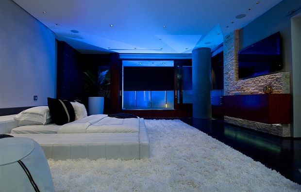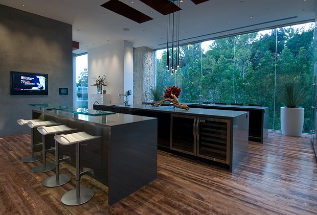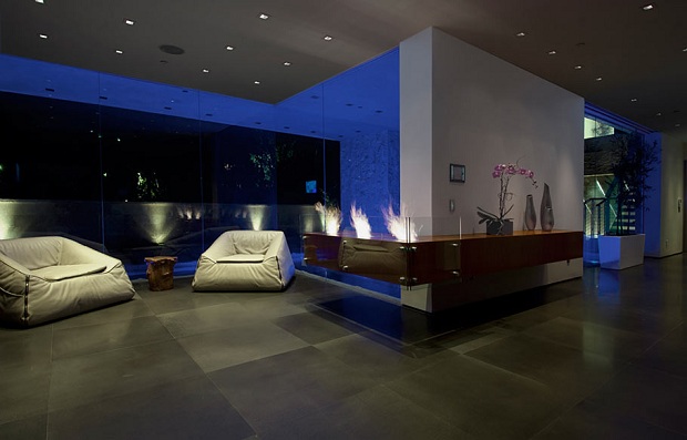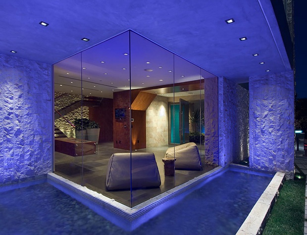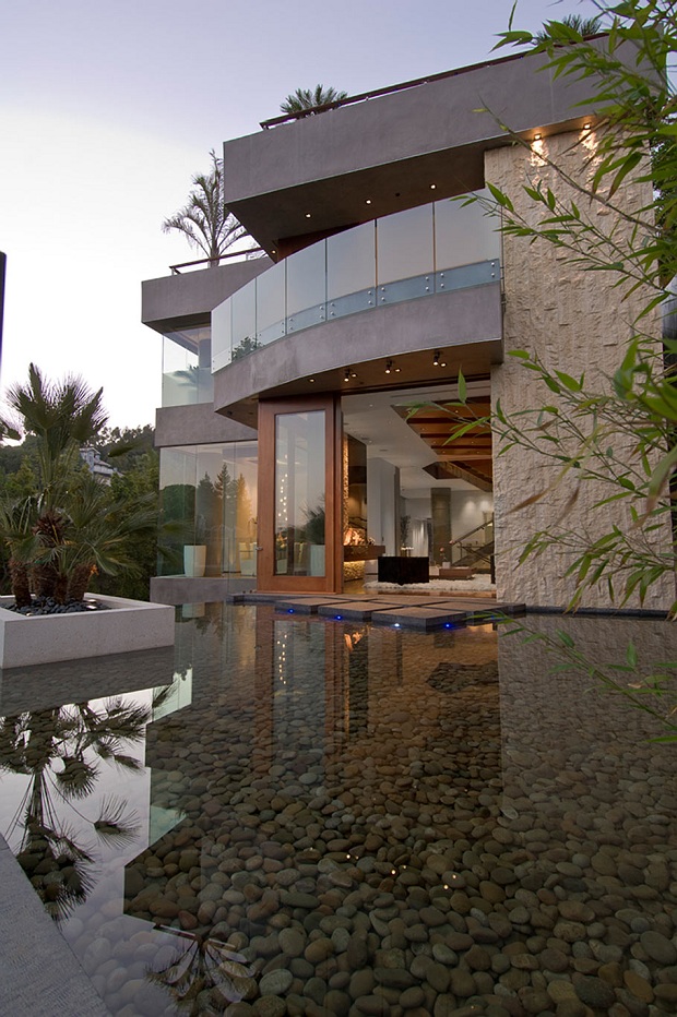 The luxury housing market in Los Angeles, California is vast, and there is never any shortage of incredibly crafted contemporary homes. The team at Ben Bacal were looking to take things up a notch with the construction of this immaculate masterpiece located at 9909 Beverly Grove. At first glance, the multi-colored lighting can be mistaken for that of a plush lounge, and paired with the waterfalls, steel encased bridges, roof top deck and pool, this house is the ultimate Los Angeles bachelor pad. The property features 3 bedrooms in addition to a maids and guest house to make up the 8300 square foot floor plan. What bachelor’s pad would be complete without a custom movie theater and 500 bottle wine cellar complete with a 3 inch glass ceiling built for dancing and entertaining.