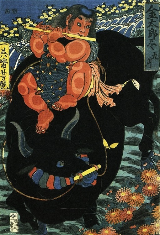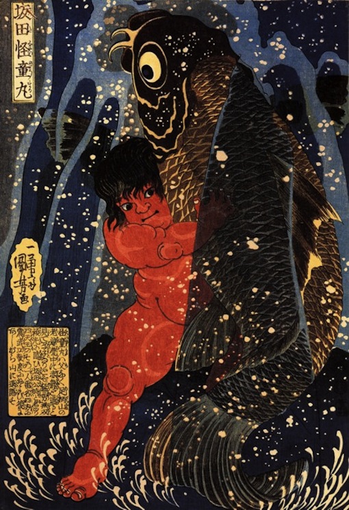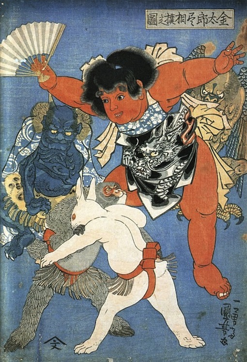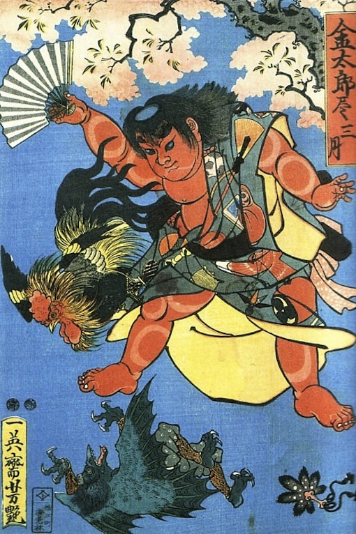 Kintaro (a.k.a. “Golden Boy”), a popular child folk hero embodying strength and bravery, appears in statues, storybooks, anime, manga, noh, kabuki and candy. He was also the subject of numerous Edo-period woodblock prints. Various legends say that Kintaro was raised by a Yamamba ogress in the mountains, where he learned to communicate with animals. As a youngster, Kintaro developed superhuman strength that enabled him to crush boulders, fight monsters and demons, uproot trees, and defeat bears at sumo. The artist Kuniyoshi has an immense collection of prints centered around Kintaro. Check the method.