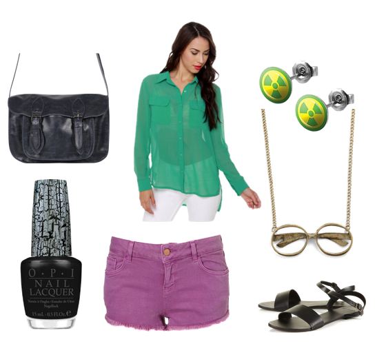 Besides a pair of practically indestructible shorts, the Hulk hasn’t got much in the way of uniform. Nevertheless, you can totally channel both the not-so-jolly green giant and his more pleasant alter ego. A trendy mint blouse and lavender cut-offs are a pastel take on the Hulk’s green coloring and purple pants. He goes barefoot, but you can wear minimalist two-strap sandals instead. Radioactive earrings add a pop of trendy neon and reference the Hulk’s origin. Let’s not leave Bruce Banner out of the equation: add some scholarly details with a navy satchel and a spectacle necklace. Finally, add the sartorial equivalent of ”Hulk…smash!” with a coat of black shatter polish.