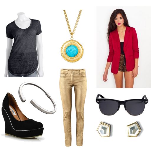 Tony Stark is all about flash and style, so make sure all eyes are on you with this bold metallic look. A sharp burgundy blazer and gold coated jeans resemble his Iron Man suit, while a charcoal burnout tee and dark sunglasses recall Tony’s too-cool-for-school attitude. Sculptural wedges with a metallic detail tie the look together. No hero’s outfit is complete without accessories, so pile ‘em on! A teal pendant not only provides a nice color contrast to the blazer, but also references Tony’s chestplate. This silver cuff bracelet might not help you suit up, like Tony’s do, but hey, it’s cute.