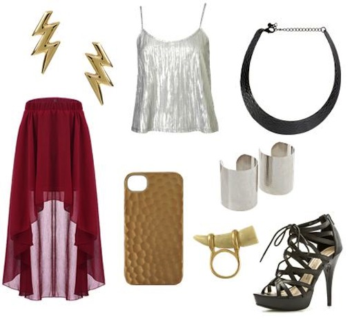 As the god of thunder and lightning, Thor wears lots of metallics, and a silver foil tank is a trendy take on his armor. Translate his flowing garnet cloak into a trendy high-low hem skirt that pairs perfectly with black lace-up heels. I couldn’t find any hammer jewelry, so go for hammered metal accessories like these twin silver cuffs and black choker necklace instead. Golden lighting bolt earrings and a horn ring reference Thor’s godly background and powers.