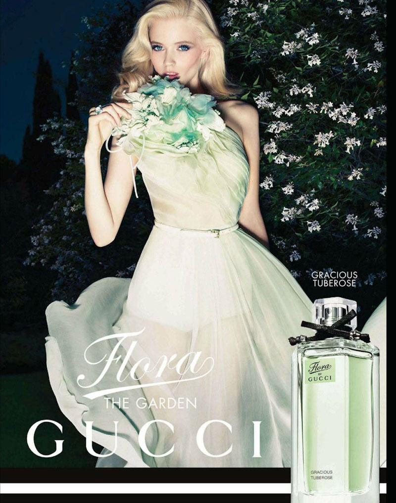 Shot by fashion photographer Sølve Sundsbø, the Flora by Gucci ‘The Garden’ Spring 2012 campaign stars Australian model Abbey Lee Kershaw. The Garden Collection features five colorful fragrances named Gorgeous Gardenia, Gracious Tuberose, Glamorous Magnolia, Generous Violet and Glorious Mandarin. Abbey Lee wears lightweight chiffon gowns in various hues corresponding to the five colorful fragrances in the collection. Packaged in Gucci’s classic hexagonal bottles, the fragrances are available as 50 and 100 ml Eau de Toilette, except Generous Violet and Glorious Mandarin that will be available exclusively at Gucci stores as 100 ml Eau de Toilette.