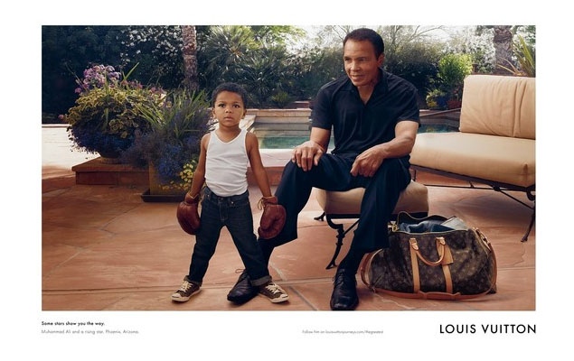Boxing legend Muhammad Ali will be featured in the new Louis Vuitton print ad launching on June 14th in 60 countries. The ad was shot by Annie Leibovitz in Muhammad’s Phoenix home and features Ali and his little grandson wearing boxing gloves and sticking his chest out. Mr. Ali now joins other icons who have posed for Louis Vuitton like Mikhail Gorbachev, soccer great Pelé, musician Keith Richards, Sean Connery, Bono, Francis Ford Coppola with his daughter Sofia, and former astronaut Buzz Aldrin. Last year, Leibowitz shot Angelina Jolie on a wooden boat in Cambodia’s Siem Reap Province for the campaign.