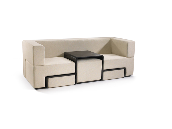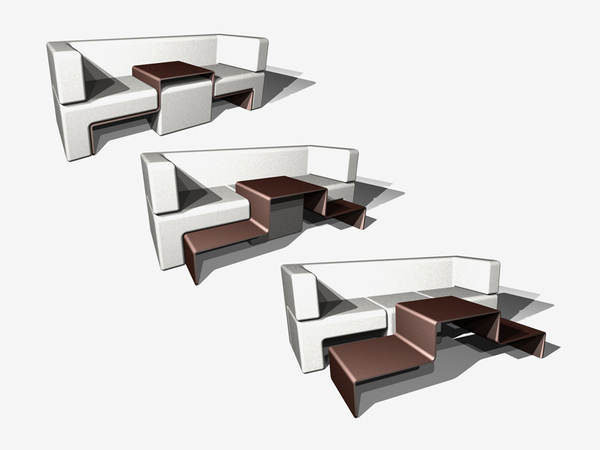 Slot is a dynamic furniture piece. The sofa system finds new value and diverse functionality by blending the sofa, coffee table, and ottoman. It utilizes the common constructional gaps found between the cushions of the sofa by converting them into tracks for which the table can slide in and out. When slotted, the table acts as a console. When freed, it acts as a coffee table. The magnetically retained sofa cushions always find and keep their optimal position either atop the table for an ottoman or below for a coffee table. Slot features traditional construction with textile upholstery and finished bent plywood.