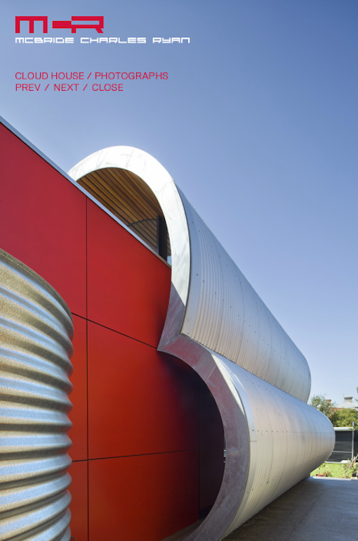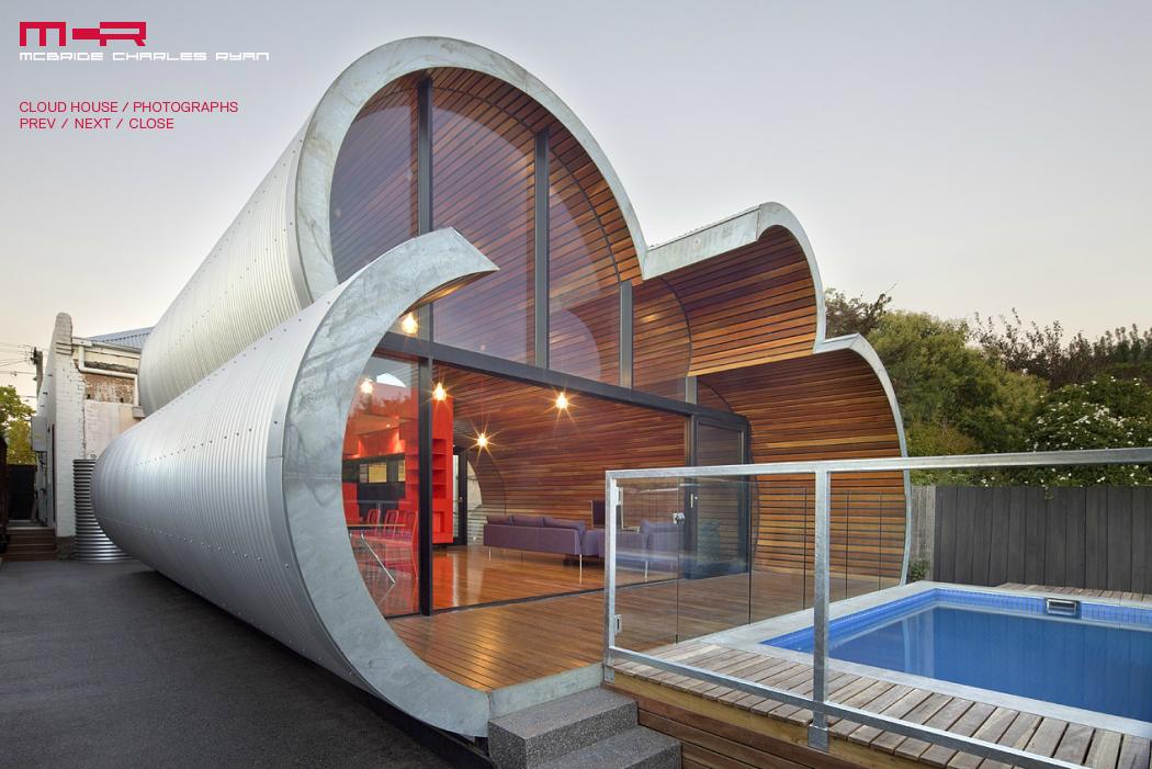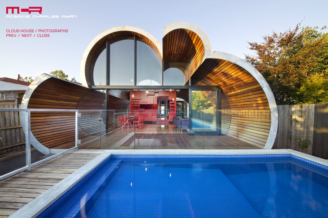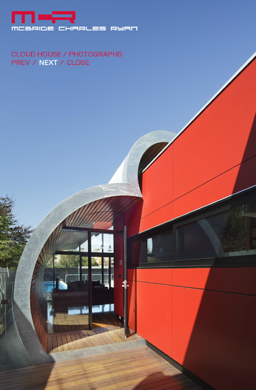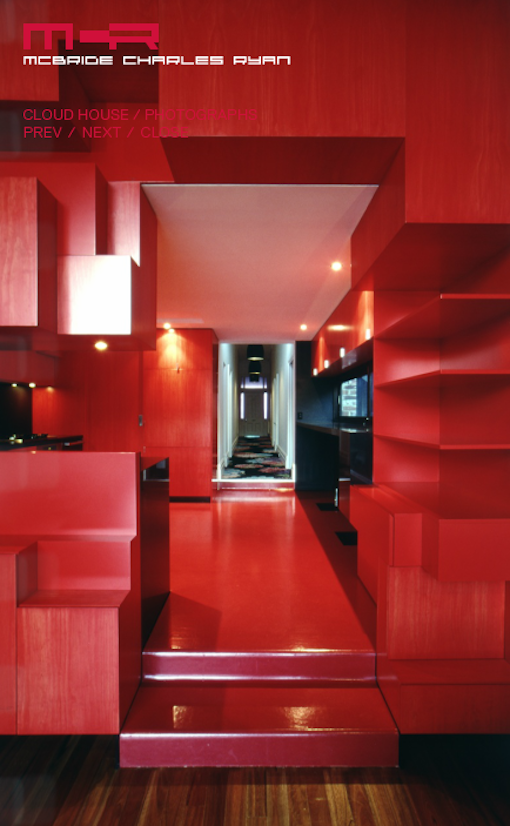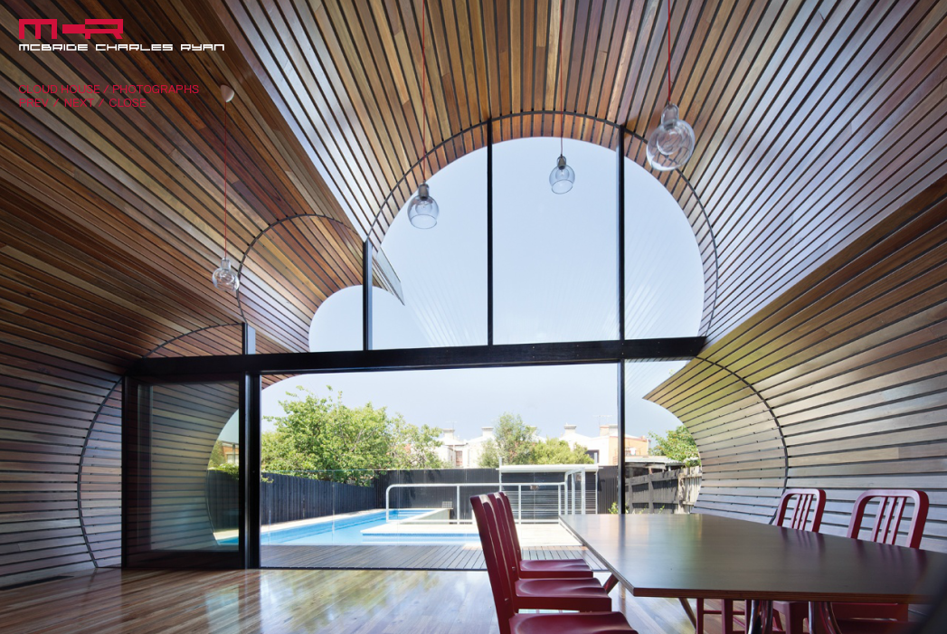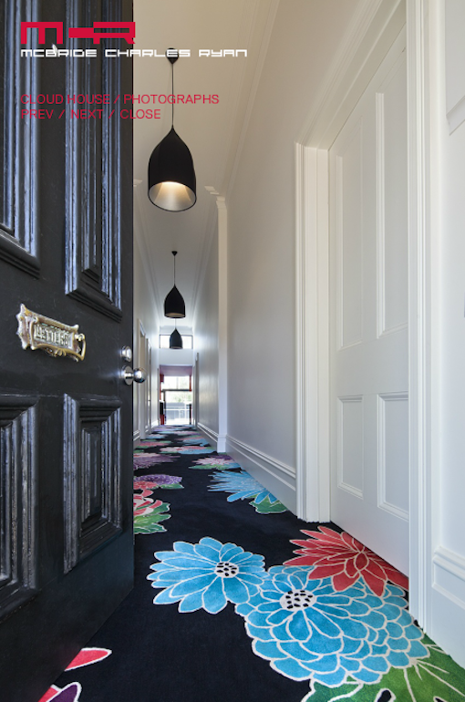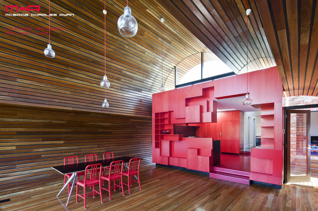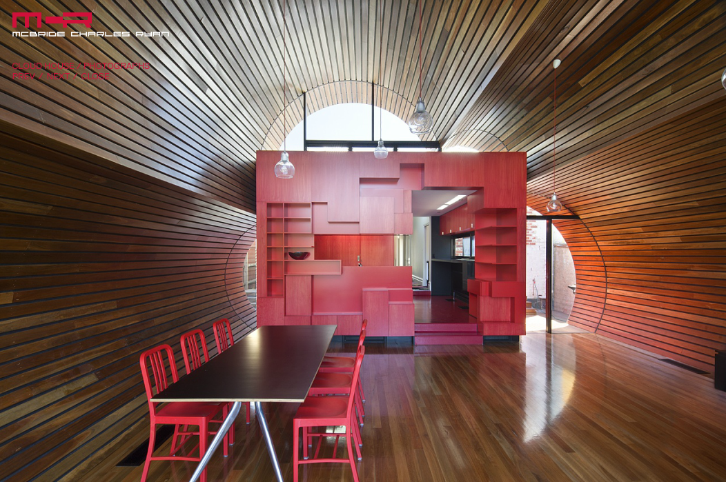 The Cloud House is an addition and renovation to a double-fronted Edwardian house in Fitzroy North. Over the course of close to a century, this house has received several additions and modifications. McBride Charles Ryans work for the house is designed in three parts. This allows for a sequence of distinct and unexpected episodes, with glimpses previewing oncoming spaces and experiences as you move through the home. The street facade has been left to demonstrate the clients respect for the evolution of the character of the area and the modest street alteration belies the extent of the comprehensive internal renovation work. The spaces within the original structure are largely white in color, united by exotic floral hallway carpet. This journey through the space is followed by encountering a disintegrated red-colored box. This is the kitchen, at the heart of the property, which acts as a bridge linking the major spaces.