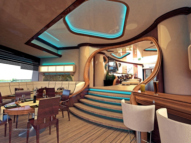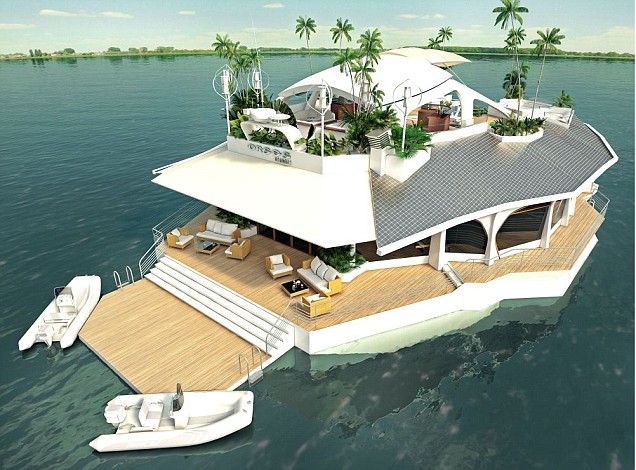 Described as being ‘more comfortable than just about any luxury yacht, the floating platform also features a bar, sundeck area, jacuzzi and aquarium. While buyers can tailor the interior and design to their own individual needs, the Orsos island comes with six state rooms, en-suite bathrooms and a restaurant area. The island is environmentally friendly and fully self-sufficient, with solar panels and wind generators providing power.
