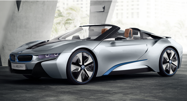 BMW has unveiled their i8 Concept Spyder. It’s absolutely incredible. They say the i8 represents a vision of the future where intelligent thinking, advanced materials and innovative construction techniques fuse together to create a high performance roadster that is outstandingly efficient and environmentally aware. It possesses, they claim, the performance of a sports car with the consumption of a city car. It doesn’t look too shabby either. Strictly a two-seater it boasts on-board equipment including a pair of electric scooters, housed under a transparent tailgate. It makes 406 ft of torque, which pushes it from 0-62 mph in 5.0 seconds and a top speed of 155 mph. Plus it can do 20 miles of 4-wheel-drive on the battery alone.