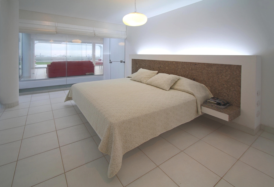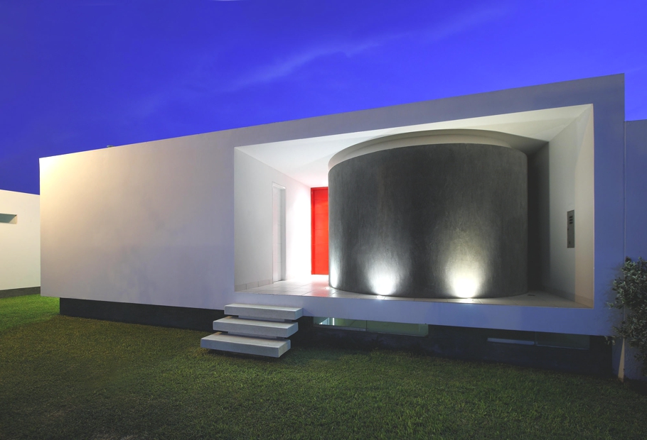 Mertopolis a Lima-based design studio has designed the House in Palabritas Beach. Completed in 2009, the contemporary property is located in the Palabritas Beach, Lima, Peru. According to the architects: “The contemporary Peruvian property is located on the first row of lots and was designed so that the architecture acted like a frame to the view of the beach and the islands that are found in front of the house. The esthetic of the house celebrates the summer with modern curves that remind us of the Brazilian architecture of the sixties. The contemporary Peruvian house has a white finish with color accents in red, in both main elements such as the swimming pool as well as furnishings. The house reminds us of competitive elements used in Stanley Kubrick films, with the white curved elements contrasted with details in red. The exterior was designed as a white elevated box, exposed from its front side. One of the sides has a concrete lattice based on a contemporary composition with perforations that allow the interior to have a transparency without losing its intimacy. Sliding the glass doors were used so the dining and living rooms could be integrated as one. An interior patio was developed on a lower level where the bedrooms and family room conjoin so that an intimate zone for these rooms are created. The main bedroom is located on the first level and was designed so that it had a view towards the ocean. As a whole the house created a contrast with red color over white surfaces, in a way that the spaces give an appearance of amplitude. From the inside of the living room, the architecture offers a frame that shows the landscape of the beach, the island and the sunset.