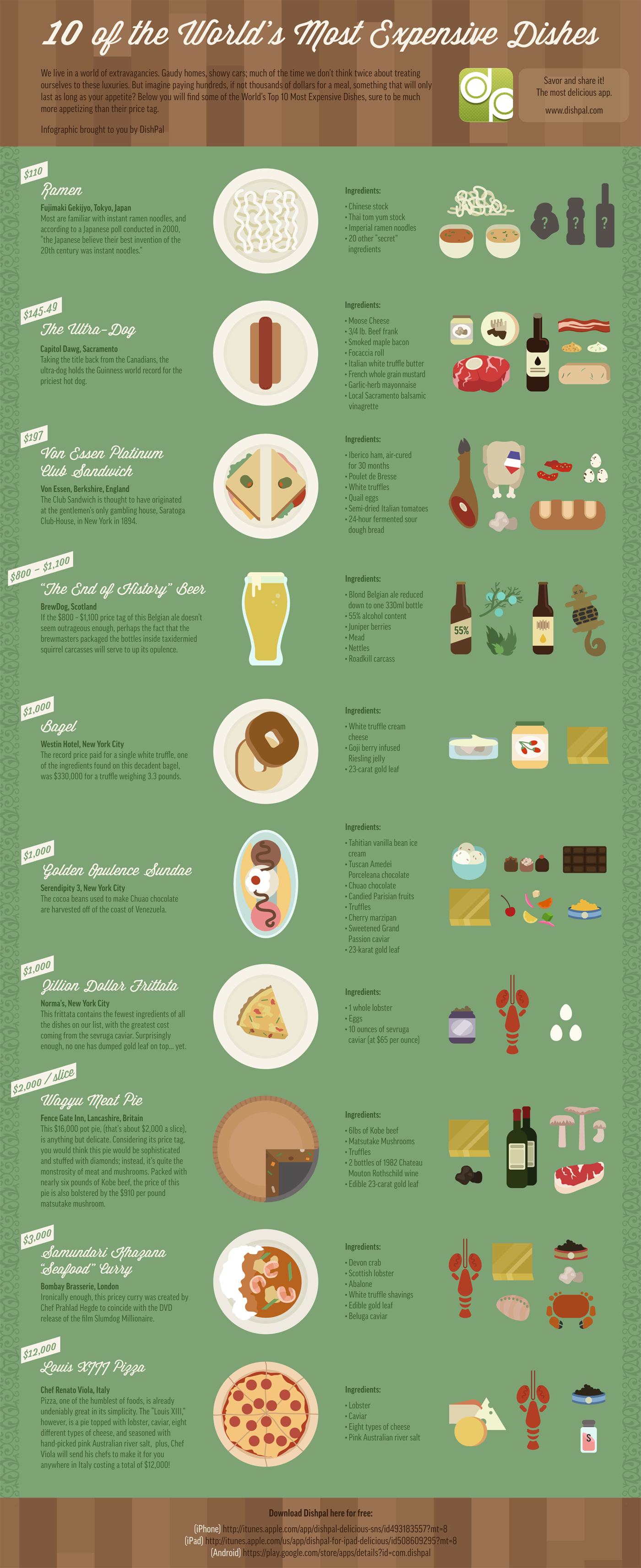 From food app dishpal comes an infographic detailing some of the most expensive foods in the world, among which are gold-lined, truffle-laced and wine soaked foods. The most expensive dish is a $16,000 meat pie sold at the Fence Gate Inn in Lancashire. Filled with 6 lbs of Kobe beef, each slice will set you back $2,000. What does that princely sum buy you? A meat pie marinated in two bottles of 1982 Chateau Mouton Rothschild, filled with truffles and Matsusake mushrooms, and edible 23-carat gold for garnish. At New York’s Westin hotel at Times Square, chef Frank Tujague created a limited time $1,000 bagel stuffed with white truffle cream cheese and goji berry-infused Riesling jelly with gold leaves (pictured above). And from BrewDog in Scotland comes an $800 to $1,100 pint of Belgian ale that comes in a dead, squirrel carcass. Other expensive foods on the graphic include a $12,000 pizza topped with lobster, caviar, eight different cheeses and hand-picked Australian river salt from Italy. And there is a Samundari Khazana Seafood Curry at $3,000, ironically released to coincide with the film Slumdog Millionaire….