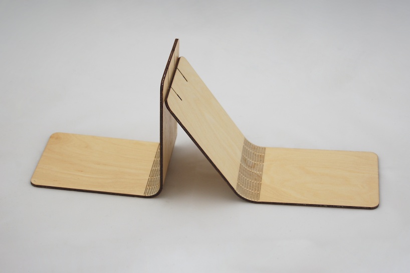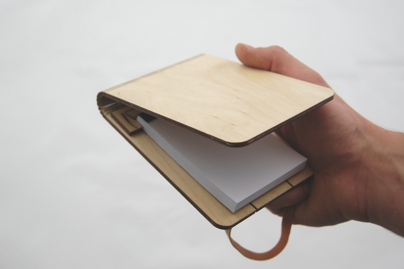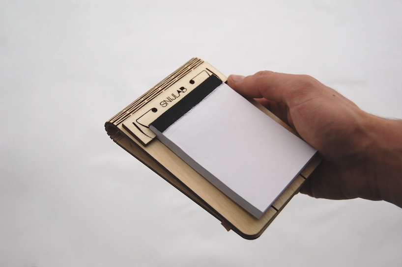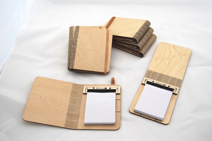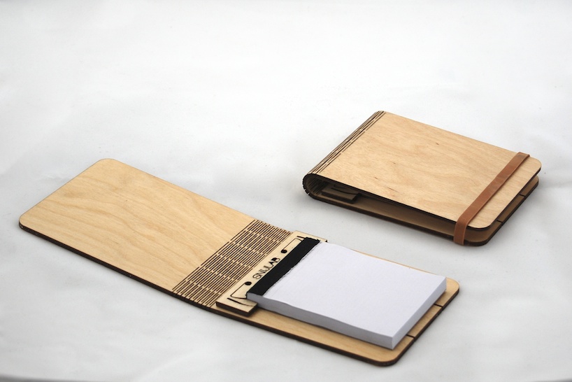 Dutch digital manufacturing company snijlab has developed new possibilities of working with wood. Using laser cutting technique they make tiny cuts in wooden sheets that allow it to be flexible. Once processed the wood can be fully bent in both directions without breaking. Snijlab makes wooden booklets with the bendable wood technique. The cover is a single sheet of wood cut from a beautiful birch plywood and finished with a clear varnish. cuts in the middle allow the cover to be flexed open and really; It’s only wood! A tiny clamp, made of the same material, holds a standard a7 writing block inside. With this design we want to show the great possibilities of digital manufacturing. By using manufacturing techniques like this in products it is possible to make all product features in only one production step and a single material. Only one machine is needed and material supply is easy. This cuts down production effort and logistics and also makes for a beautifully simple product because a laser cutter is a fairly common tool these products could also be manufactured locally, all over the world. That saves transport. By working from flat materials the products can also be flat-packed, saving even more resources and costs on shipping. These kind of advantages make digital production a great new way of making things.