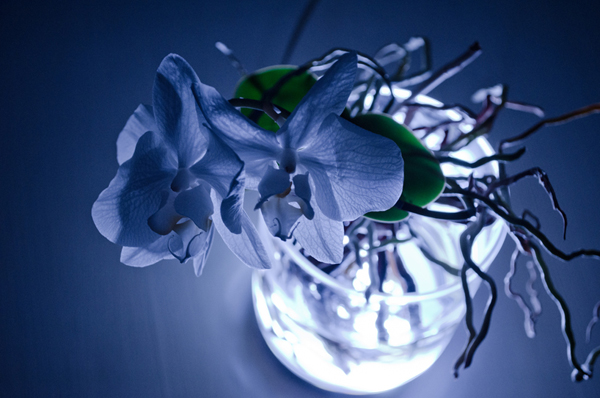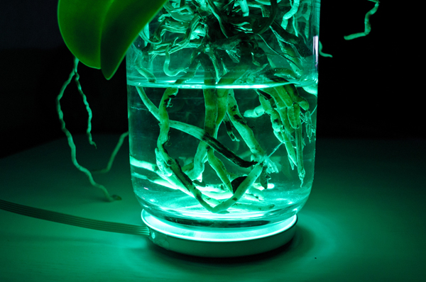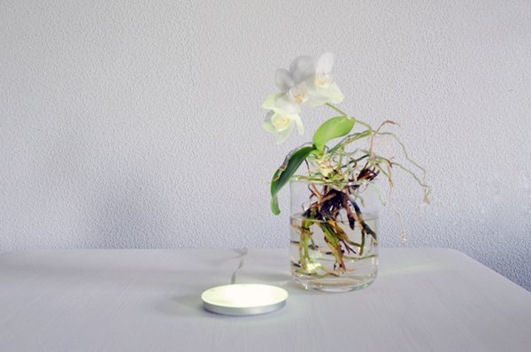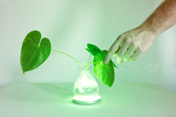 The latest in a trend of garden & light combinations, the Aura lamp is an experiment in interactive objects that combines nature, water & light in a unique design that strengthens the bond between object & user by changing color with a simple touch of the plant’s leaves. The system uses an aluminum base with LED RGB modules that shine through the glass container. By touching the plant the user grounds the system & activates color changes, power & light intensity.