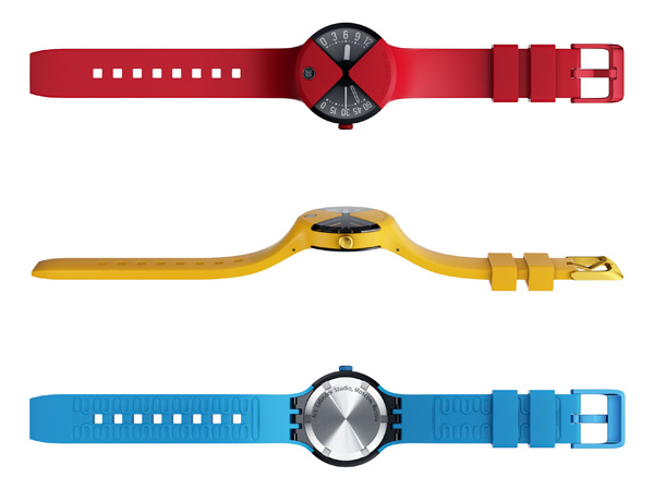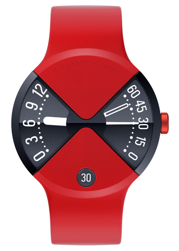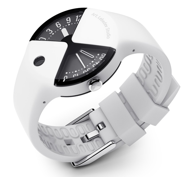 This beautiful quartz watch designed by the good folks at Art Lebedev Studio. It features the body merging with the band. Two wedged displays showcase the hours and minutes/seconds separately; The date appears in a small window. The band is crafted from a flexible silicone material and fits your hand comfortably, while the body is all aluminum.