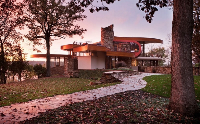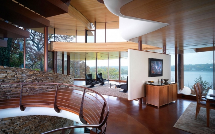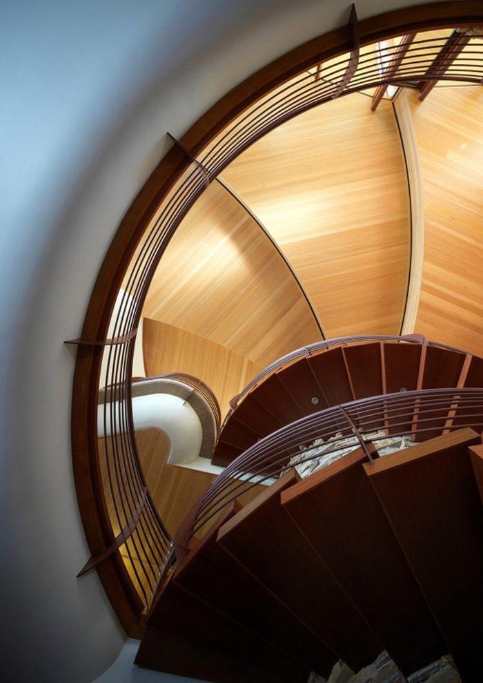 This curvaceous Wisconsin home was custom built by architect Robert Harvey Oshatz. The inside features a gorgeous spiraling hem-lock roof that “sweeps over the entry and lifts the upper floor before disappearing from plain view”. The Chenequa Residence is almost completely constructed from natural materials that Mr Oshatz sourced himself and with it’s beautiful outdoor landscape, each area of this home celebrates the resounding beauty of nature.