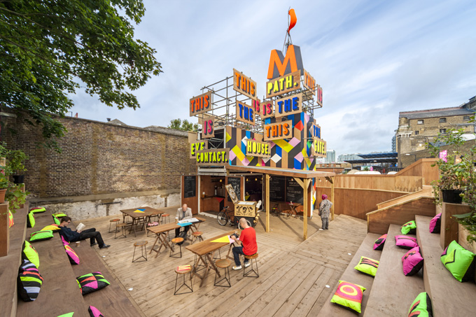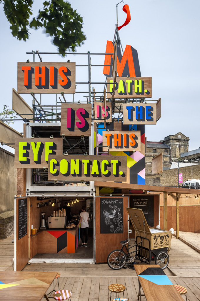 The fresh temporary Movement Café and performance space built next to the DLR station in Greenwich, South East London. It was constructed in 16 days to be ready for the opening of the Olympics. It is located at the gateway to the Olympic borough, on Greenwich Industrial Estate, currently being redeveloped by the Cathedral Group. The Café was designed by British designer and artist Morag Myerscough and he collaborated with poet and tweeter Len Sissay.