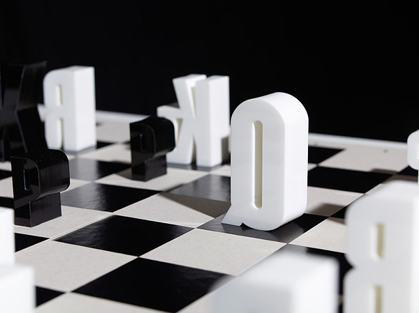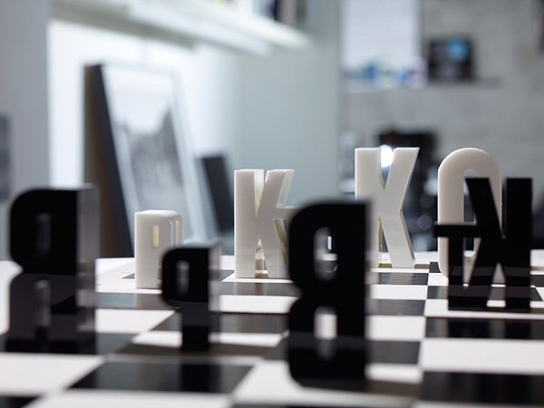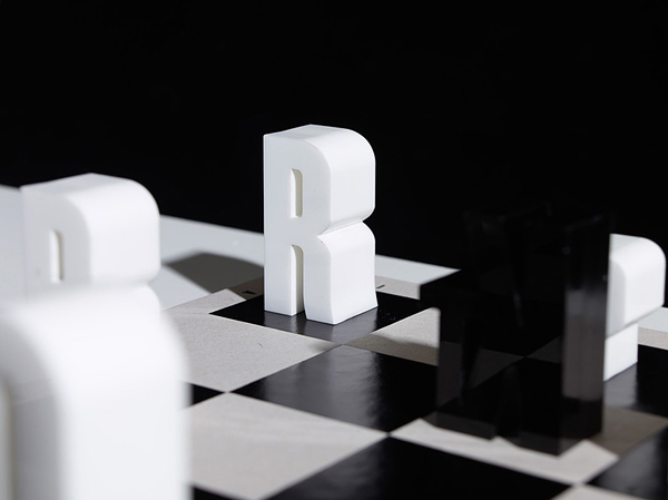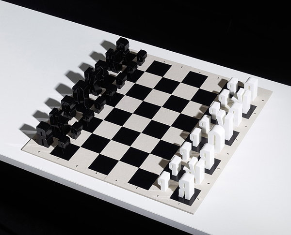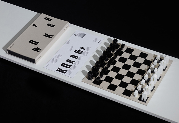 Designed by Hat-Trick Design, this typographic chess set is based on chess notation, K for king etc. The forms are based on the typeface Champion (lightweight) by Hoefler Frere Jones. The limited edition of 50 sets are laser cut from 25mm acrylic. The king is 50mm tall, the pawn is 30mm. The board is made from two 2mm pieces of greyboard, and foiled in black. The whole set comes in a foam tray with a greyboard sleeve.
