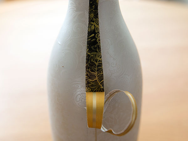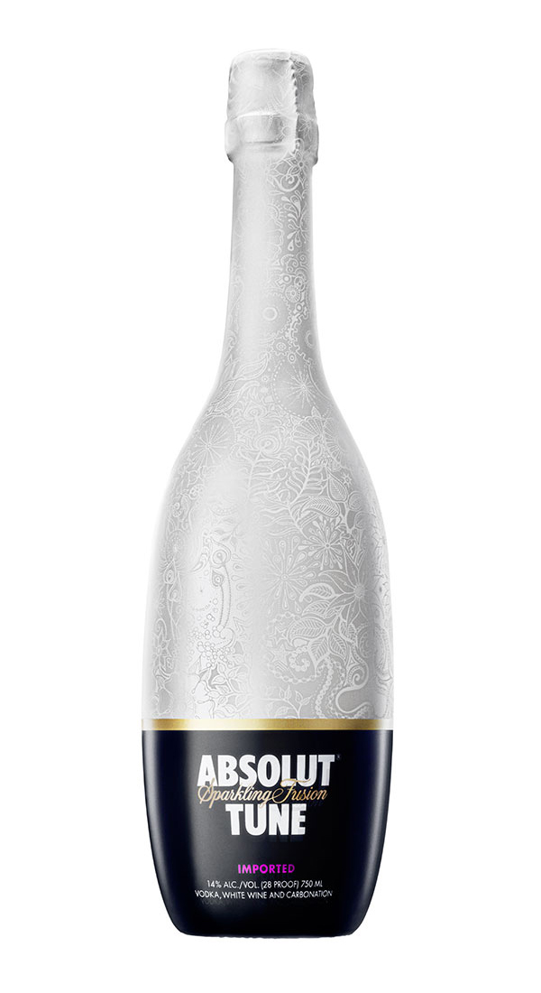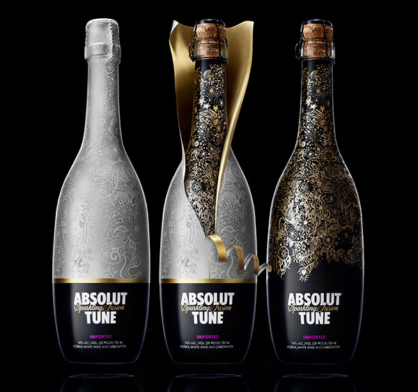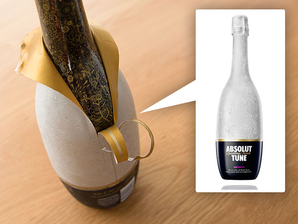 Absolut Tune is a sparkling fusion of Absolut vodka and crisp white wine. This champagne like bottle has a very Tord Boontje-esque double layered, flowery pattern to it. The caged cork glass bottle has two layers of plastic on it – one with a gold on blue, and the top layer with a matte/pearly white lined with gold that peels back ever so dramatically.