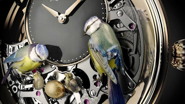 Jaquet Droz is known for their rich history of creating automata. This time they amaze us with their newest creation, the Bird Repeater. A combination of a minute repeater and an automata of birds feeding three chicks, of which one comes out of an egg, while the water of the stream flows in a continuous cascade. The dial is totally done by hand and is incredibly well-detailed. The base dial is mother of pearl, which is hand-engraved and painted. The waterfall done on a rotating disc which spins to create the illusion of falling water. The birds and nest are also hand-engraved and painted individually. The animation sequence has an impressive level of action with wings opening, eggs hatching, and chicks being fed. Just 16 pieces will be made, 8 in 18-karat gold and 8 items with diamonds. The price will be close to half a million Swiss francs.