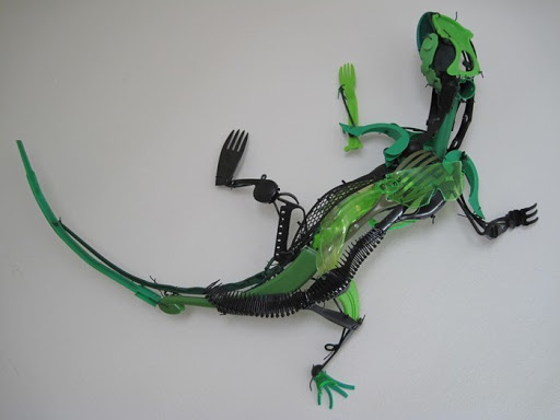 Born in Yokohama, Japan, Sayaka explains that, “Japanese Shinto beliefs are such that all objects and organisms have spirits, and objects that are discarded before their time weep at night inside the trash bin… or so they teach children at many preschools.” Whether truth or tale, the image stuck with Sayaka as she moved from country to country. “I had a strong desire to fit in, and to make people and objects surrounding me fit together to create harmony,” she tells. “My goal is for each object to transcend it is origins by being integrated into the form of an animal or some other organism that seems alive and in motion.”