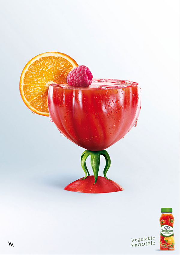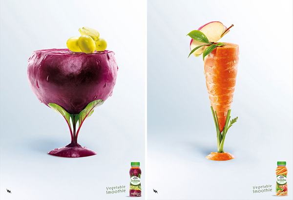 Each image in this collection shows vegetable cocktails fromPierre Martinet. The Pierre Martinet Smoothie campaign was created by BEING TBWA, an ad agency based in Paris, France. It features colorful goblets made out of the veggies each smoothie consists of. For instance, one is made out of an egg plant while another from a carrot. It was art directed by Jean-Pierre Roges.