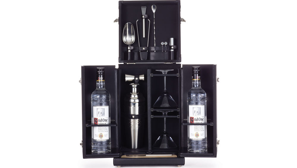 Tumi, one of the world’s leading brands in luxury travel bags and accessories, has released a Mixology Set as part of its 2012 holiday collection. Each one ($3,995) conceals a broad range of bar accessories masked as a suitcase, with a handmade leather exterior with nickel hardware and a stain-resistant fabric interior with leather recesses that secure its contents. Designed in collaboration with liquor distributor Diageo, the bag comes with barware for every cocktail craving—from martini glasses to shakers—as well as essentials to the craft, including one- and two-ounce jiggers, a zester, a stirring spoon and fork, a wooden cutting board, an ice bucket, and built-in space to hold the bottles. The exterior of the case exudes sleek features including Tumi’s signature black ballistic nylon, leather luggage tag and a monogram patch.