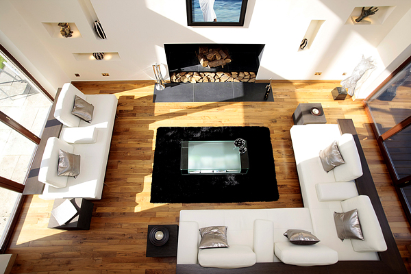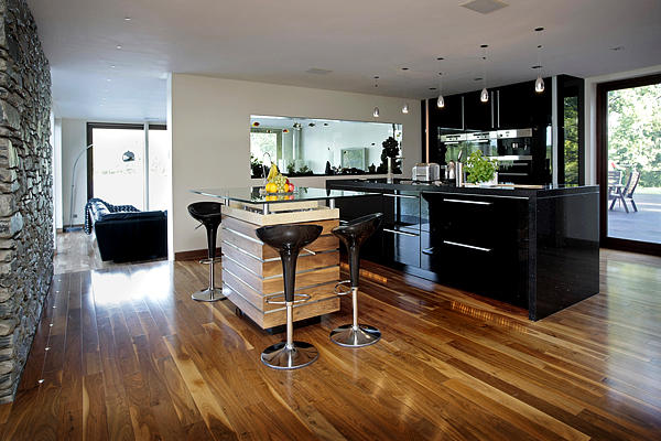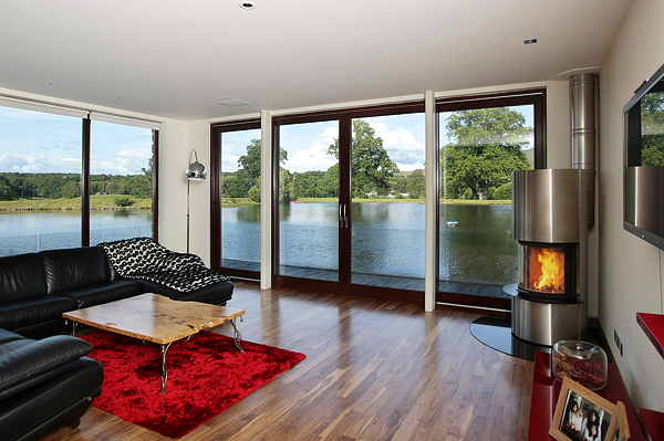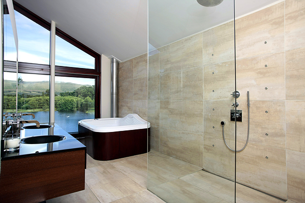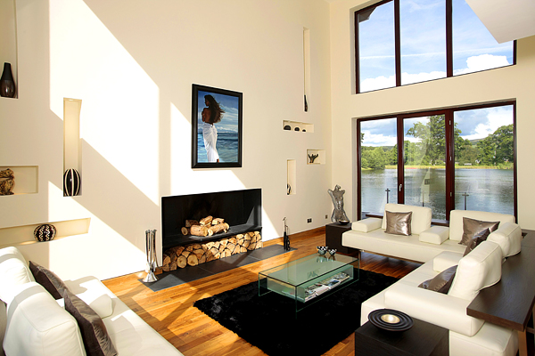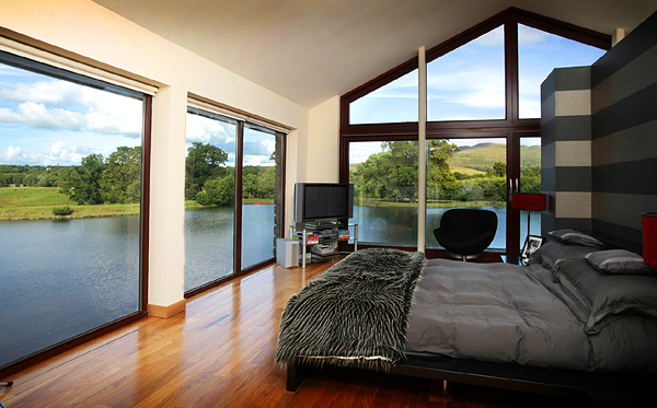Although it is most definitely a 21st-century, open-plan home with all the fittings you would expect, the American-walnut flooring emerges with the loch view to create the feel of a traditional log cabin. In fact, everywhere you move in this property is designed to remind you of your place within the wider environment. Even if you aren’t facing a window directly, ingenious positioning of reflective surfaces brings the outside into every corner of the home. Four bedrooms – three with en-suites – two walk-in dressing rooms, Jacuzzi whirlpool bath, sauna and wet room shower are included in the property, along with the usual open-plan kitchen-dining area and two terraces. In addition to the interior of the property, the outside is equally impressive. Electric gates open onto a gravel driveway, which sweeps through the grounds towards the property itself.