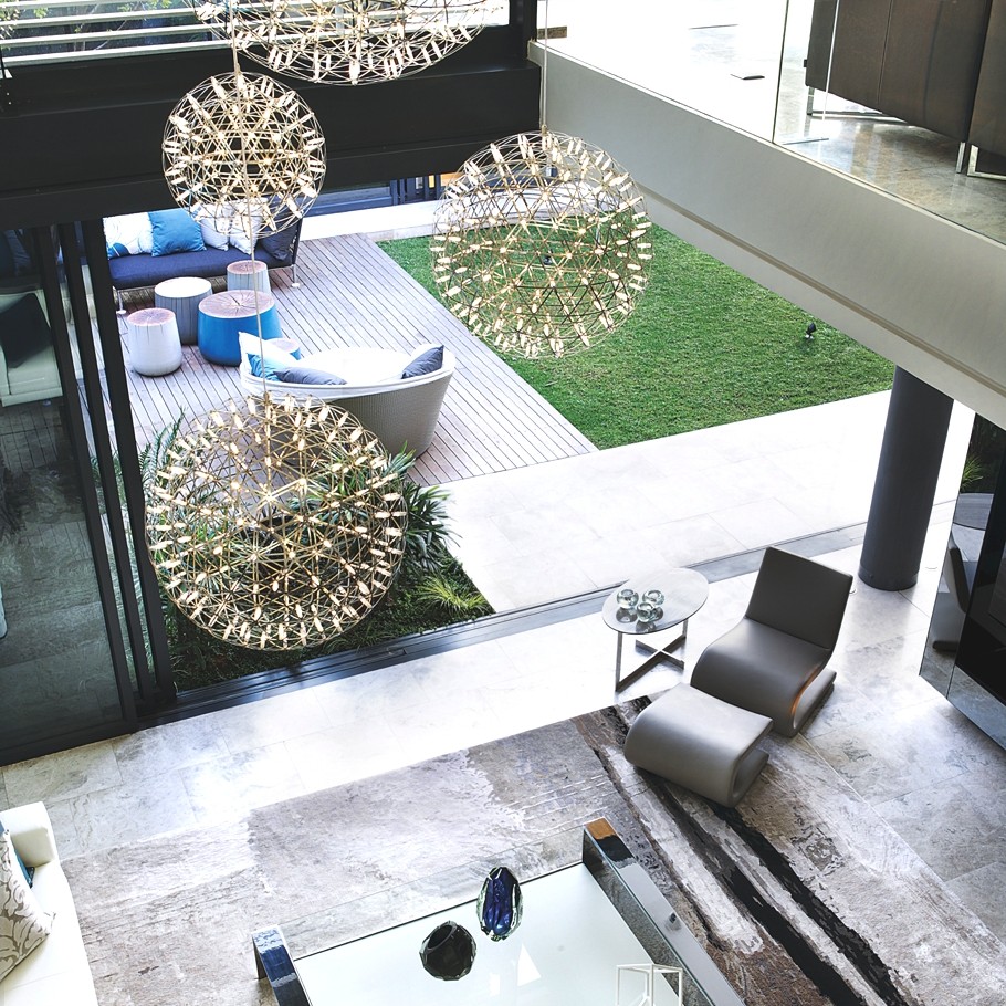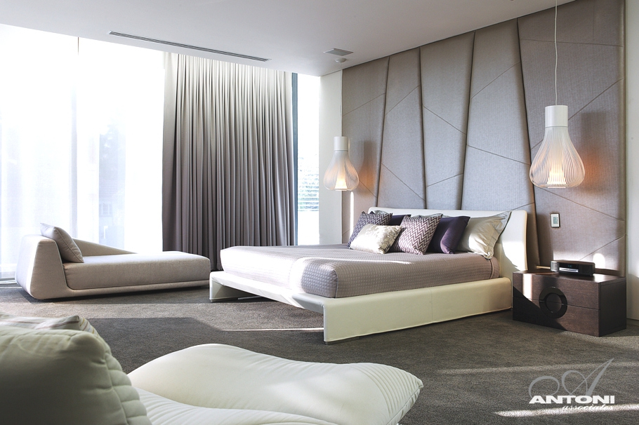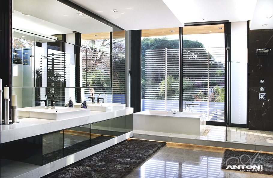 Antoni Associates an interior design specialist firm were appointed to create a contemporary interior which needed to reflect the family’s lifestyle. The décor and furniture selected are modern and have strong lines to complement the linear architecture. A number of bespoke furniture pieces were designed by OKHA Interiors. Neutral palettes with accent colours have been used throughout. Strong graphic rugs add drama and texture to the rooms which offset against the solid architectural surfaces. Curated art by South African artists amongst others Lyndi Sales and Philip Barlow have been placed throughout the contemporary South African property.