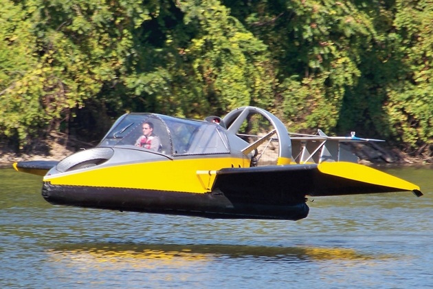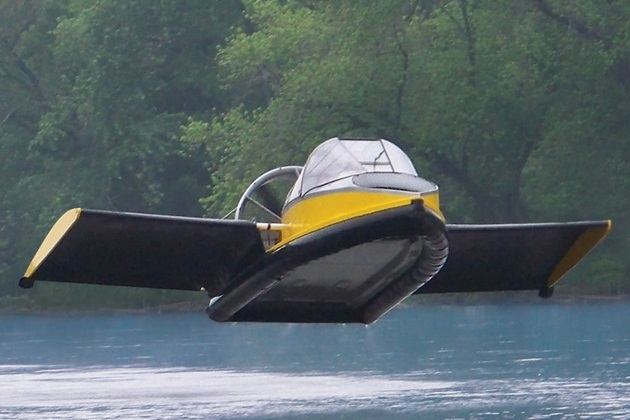 Is it a boat, plane or a flying boat? No no its a Flying Hovercraft that glides over land and water yet also soars in the air up to 70 mph with the aid of integrated wings. The flying hovercraft is powered by a 130-hp twin-cylinder, liquid-cooled gasoline engine, turbocharged and fuel-injected. The flying hovercraft can fly you over the fresh or saltwater and up to 30% inclines over sand, mud, grass, swamp, desert, ice, and snow, its wings and horizontal elevator enable pilots to simply hop over water or land-based obstacles up to 20-inche high insurmountable to a typical hovercraft.
