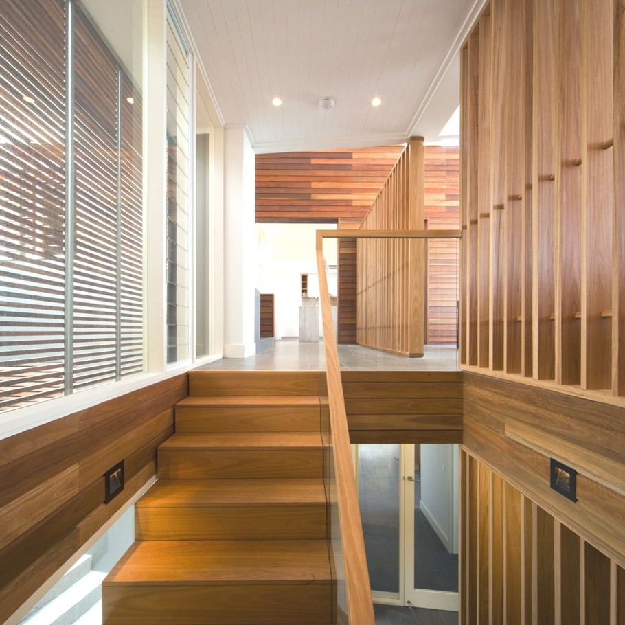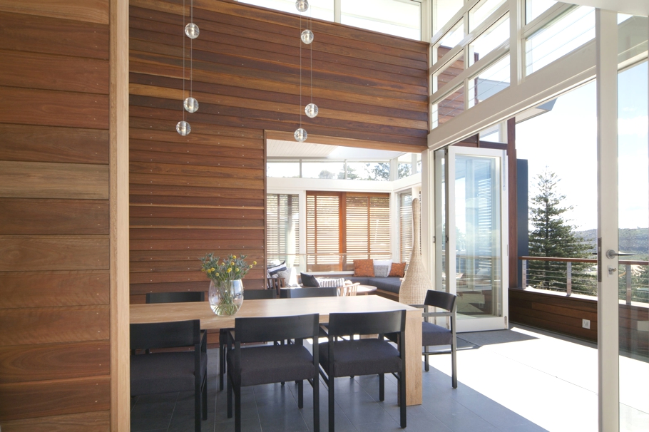The client had visited our recent project, the exclusive Qualia resort on Hamilton Island and wanted us to bring this resort feel into his beach house. He wanted a laid back feel that was intrinsically calming. A particular request was ‘to be able to sit on the view’. This required an extensive re-think to the planning of the whole house. The kitchen and living areas were completely re-planned to create larger spaces that flowed seamlessly into one another. Balconies were extended and an automated sliding roof was installed over the living area to allow the house to literally ‘open up’. It was important for us to maintain an Australian feel and avoid the Bali cliché’s in producing a resort aesthetic. Although the aim was to have open spaces that were more communal and social this needed to be balanced with quieter spaces. The use of built in banquettes throughout the contemporary Australian house created intimate spaces to sit and escape or soak up the view. A particular innovation was the installation of the retractable roof that spanned over the whole living area.As the project was a refurbishment, there was always a carefully considered approach to what we could re-use. The bones of the house were good, so nothing was demolished without justification. Some of the elements from the existing house, such as some large timber beams were re-used into the landscaping. There was also an emphasis on improving the amenity of the contemporary house. The building changes meant that ventilation and light penetration were improved greatly. The use of custom made sliding timber and glass louvered screens meant that these elements could be controlled and flexible and therefore prevented a drain on artificial heating/cooling and lighting.