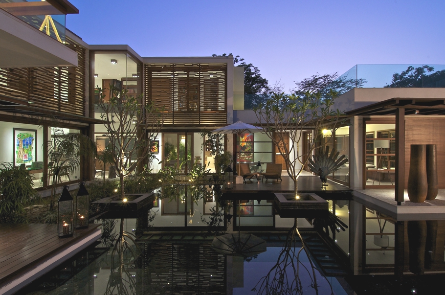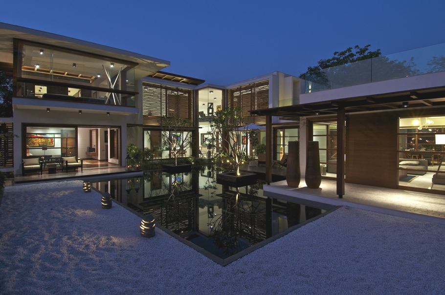 Ahmedabad-based (India) design practice Hiren Patel Architects have completed The Courtyard House project. Completed in 2012, the stunning property resides in Ahmedabad, Gujrat, India. The Courtyard House was designed with a grid of 7’x7’. The house has been designed in such a way that all living spaces and passages face the garden, which was also the main design concept, thus creating a central courtyard which holds the reflection pool making it a major design element. This also makes the design an introvert one, leaving the garden at the back of the property but still visible and accessible from all the rooms of the contemporary Indian house.