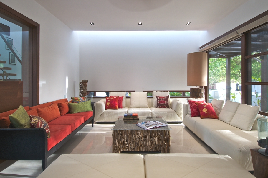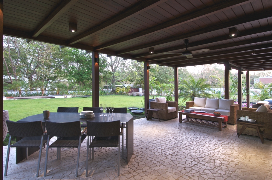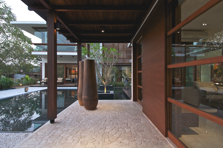 The formal living room comes first along with two bedrooms followed by a 9in wide passage parallel to the central courtyard and reflection pool. The passage ends with the dining and family room. This area is is utilised to its maximum, thus has a big verandah on all three sides, which adds the value to the north side garden. This luxury Indian property has a large size of openings and skylight to allow ample amount of light to flood the rooms throughout the day. It is also a crucial feature in Ahmedabad climate. Light is essential but not scorching heat. Screens and deep verandah protect these huge openings from the harsh sun. Verandahs also become wonderful outdoors spaces during relatively cool evenings and mornings. The contemporary Indian property is made of RCC roof structures covered with wood. Also verandah and upper rooms are covered with wood. Floors are covered with natural marble stone and wooden planks. Custom designed doors and windows are made of wood and laminated glass.