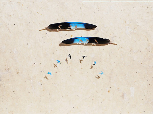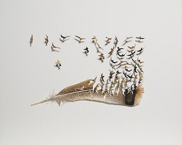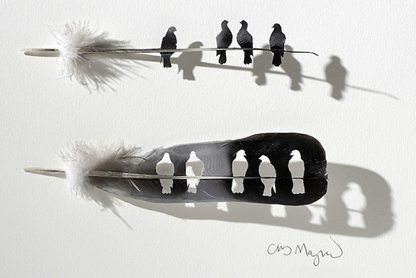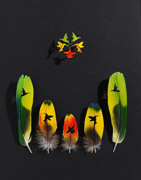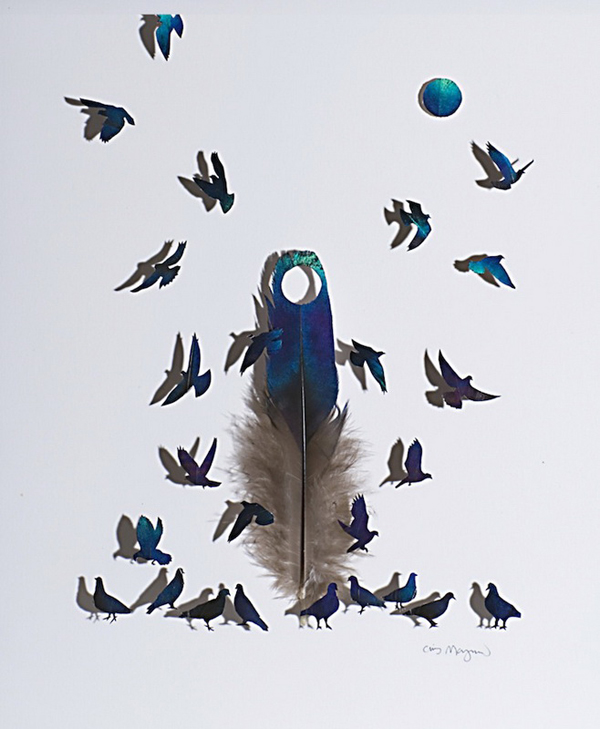 By applying various techniques spanning the disciplines of art, design and craft American artist Chris Maynard carefully sculpts mini dioramas of the the flighted creatures. Maynard uses small eye surgery scissors, forceps, scalpels, and magnifiers to arrange the cutouts of feathers that have been used with permission from private aviaries and zoos.
