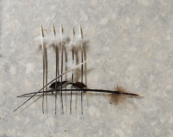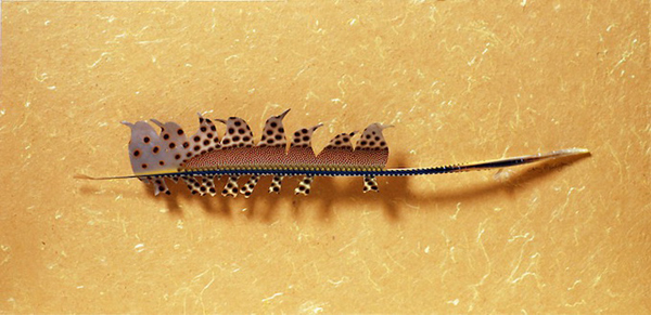 Feathers are structural wonders, serving many functions. They also suggest important universal themes. Feathers are my medium. They are an ultimate achievement of nature and a pinnacle of wonder. After feathers perform their functions on birds, they are molted yearly but keep their beauty and complexity. I want to show feathers in a different light, off the bird. I enjoy highlighting aspects of a feather’s form, pattern or color. If I am successful, I hope to convey some intimate sense of the bird that grew the feathers… feathers are one of life’s perfect wonders; with this in mind, the three dimensional forms, colors, and shapes are preserved as they were on the birds they came from. – Chris Maynard