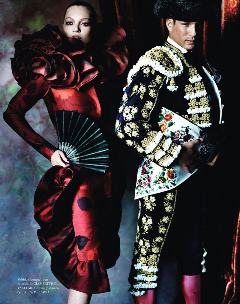 Supermodel Kate Moss stars in these striking images lensed by Mario Testino for the December cover story of Vogue Spain. Styled by Sarajane Hoare, the British beauty poses alongside Spanish matador José Mari Manzanares in some of the season’s most opulent looks. Designs from the likes of Christian Dior, Alexis Mabille, Dolce & Gabbana and Lanvin are complemented by the glam touch of hair stylist Sam McKnight and makeup artist Charlotte Tilbury.