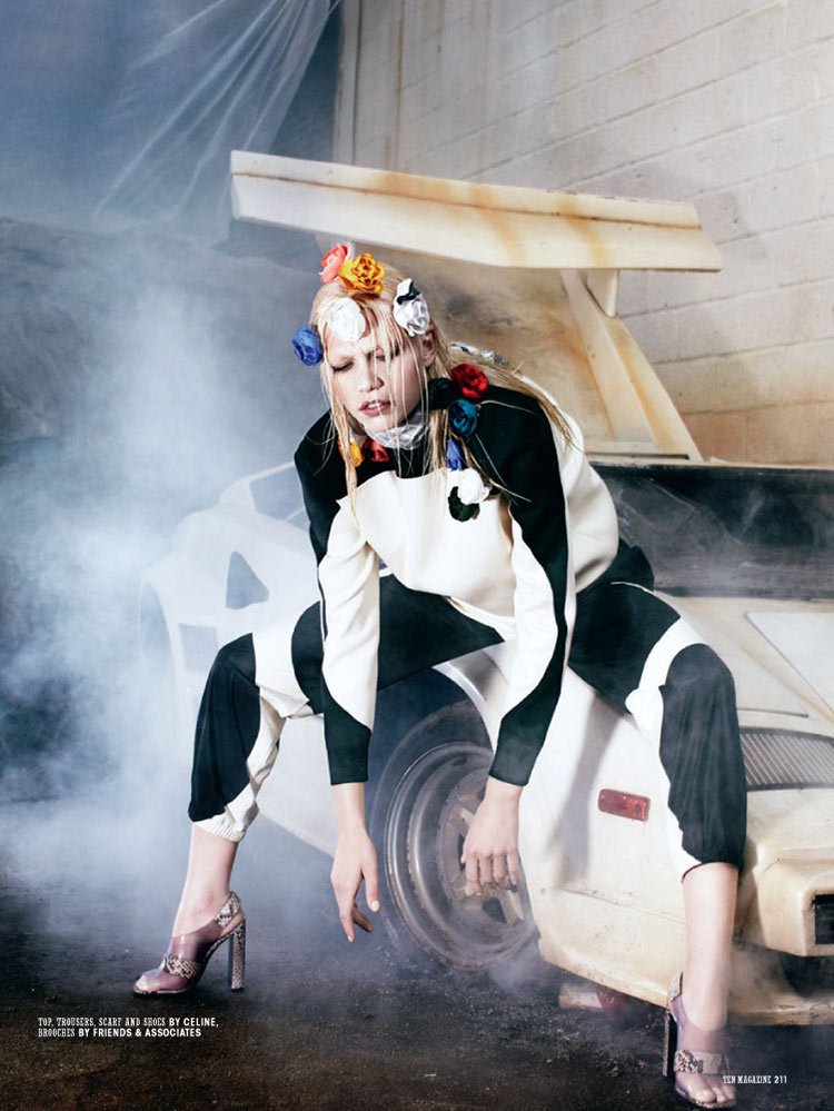Carioca Cruising is the latest editorial photographed for the winter-spring issue of 10 Magazine. Brazilian beauty Aline Weber dons offbeat looks in Christian Anwander’s colorful images taken at a car wash. Stylist David Vandewal selects standout looks from the likes of Proenza Schouler, Celine, Friends & Associates and Acne. A bold eye by makeup artist Sil Bruinsma and wet tresses by hair stylist Andre Gunn complete the quirky ensembles.