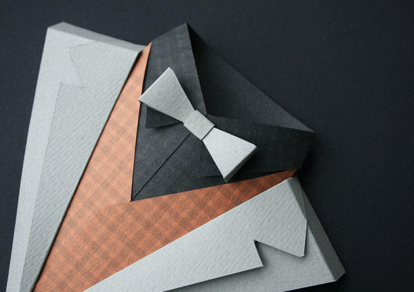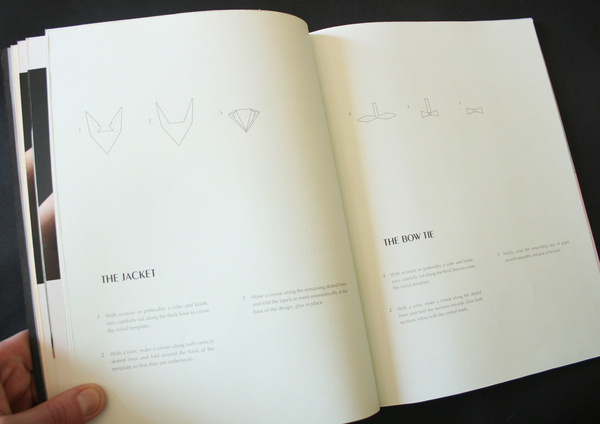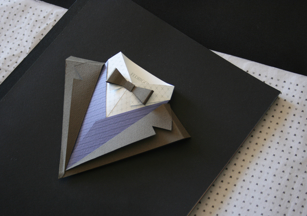 The designer chose to create dinner jackets because not only do they portray a strong image of quality, but just as importantly, classic, traditional design.He developed four templates, one for each element of the outfit, shirt, waistcoat, jacket and bow tie. Once each element is made they simply slot together, allowing you to make your own, and experiment with the different paper qualities and colour combination until you are happy with the outcome. Fedrigoni claim that their papers are ultra functional yet wonderfully expressive, this inspired him to produce a wide range of styles, from simple, subtle colours and patterns to much more elaborate combinations. The book would be sent to Fedrigoni’s existing customers, of which a large majority are top fashion labels, promoting the new color tool.